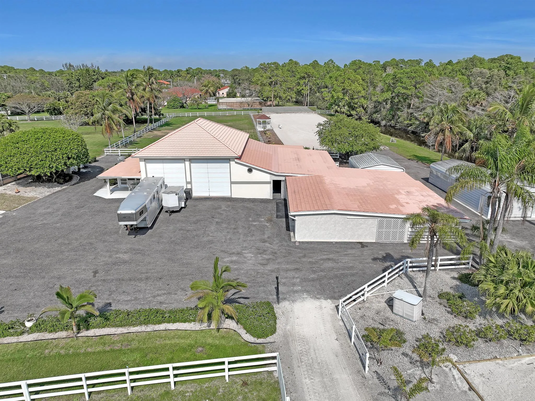 This 24-stall courtyard-style stable & training facility offers total flexibility of use. Situated on 14 acres, the stable’s mirror image layout allows perfect privacy for your horses, separate from boarders. There are 2 tack & 2 feed rooms, 2 wash-rack areas, and 2 apartments, totaling 6Br. Horses relax in this Florida open-air design with tranquil views to the inner-patio sanctuary. There is a 4Br/2Bth apt. on the East end of the stable and a 2Br/2Bth apt. on the West end. Both have a primary bedroom w/ in suite bathrooms. Adjacent to the stable is the covered arena (199′ x 67′) with GGT footing & attached storage garage (61′ x 31′ totaling 1,891 sq. ft.), a 4-horse exercise walker & 12 grass paddocks. There is plenty of room for an outdoor arena & to build your custom estate home!