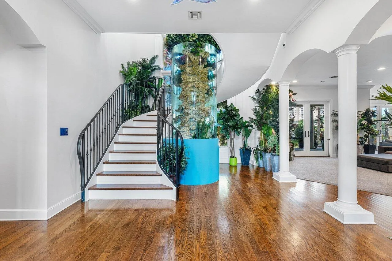 This new-construction coastal-style estate, just steps from the beach in a beautiful island-side neighborhood, features an astutely composed, flowing floor plan organized around an inner courtyard. Extraordinary dual kitchens include a chef’s kitchen and a secondary full-service butler’s kitchen. The primary suite is ultra-luxurious, and the estate also has a gym and inviting pool area.