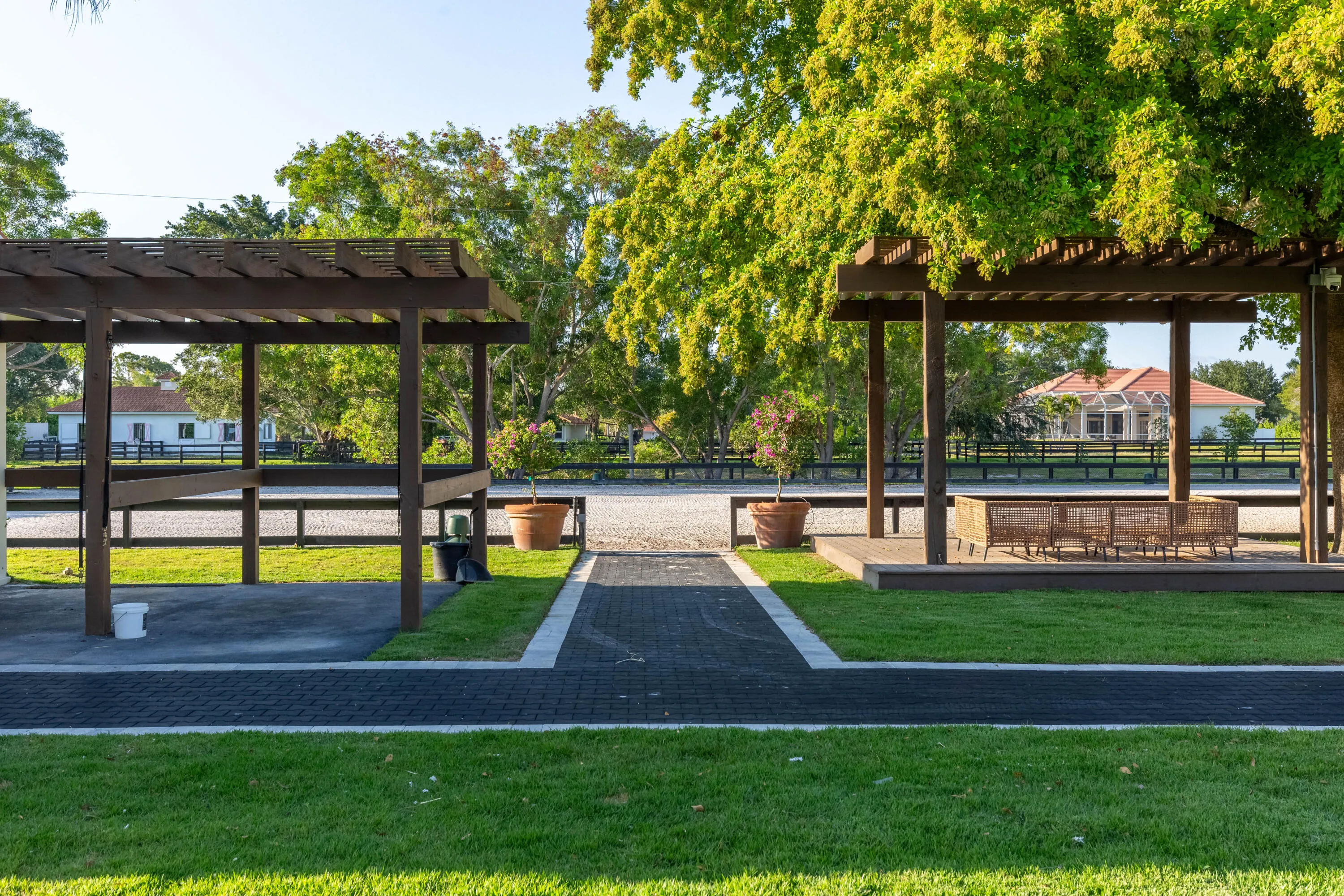 Price reflects horse stall per month during off seasonal months. This ultra private, well-equipped farm just under 5 acres, is located at the end of the street in Sunglade, Wellington and offers uo to 15 stalls for rent during the off seasonal months. The property features 2 barns, one 9-stall center-aisle CBS barn with rubber pavers, a 1 bed/1 bath apartment, A/C’d tack & feed rooms, fly spray system, a full barn bathroom and 4 covered wash stalls. The second barn with 6 stalls is a wood shed row barn and has 2 covered wash racks. There is water and fans to each of the stalls and they are all matted. R/O water system to both the barns.The farm is set up with 2 RV hookups, 10 grassy paddocks and arena with a newly built viewing gazebo where you can relax in the shade and watch your hors