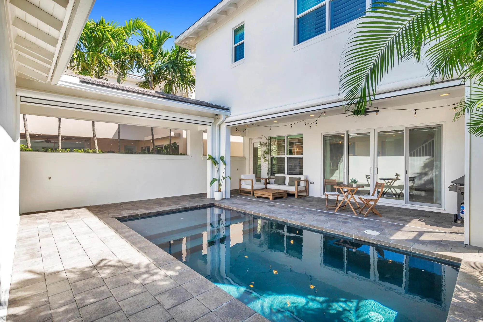 Welcome to a luxurious oasis where contemporary Island style meets unparalleled comfort & sophistication. This exquisite home, boasting over $70,000 in upgrades, is a masterpiece of modern living, seamlessly blending indoor elegance with outdoor extravagance. Once inside, the open floor plan reveals 18” tile floors, 8 ft. doors, & volume ceilings that accentuate the spaciousness & airiness of the home. The heart of this residence is the gourmet kitchen, a culinary marvel featuring 42” raised panel cabinetry, quartz countertops, a tile backsplash, & upgraded stainless steel appliances, including a natural gas 5-burner cooktop. The center island with an under-mount sink offers both abundant storage & a perfect spot for casual dining. Entertaining is a delight in the great room, kitchen, &