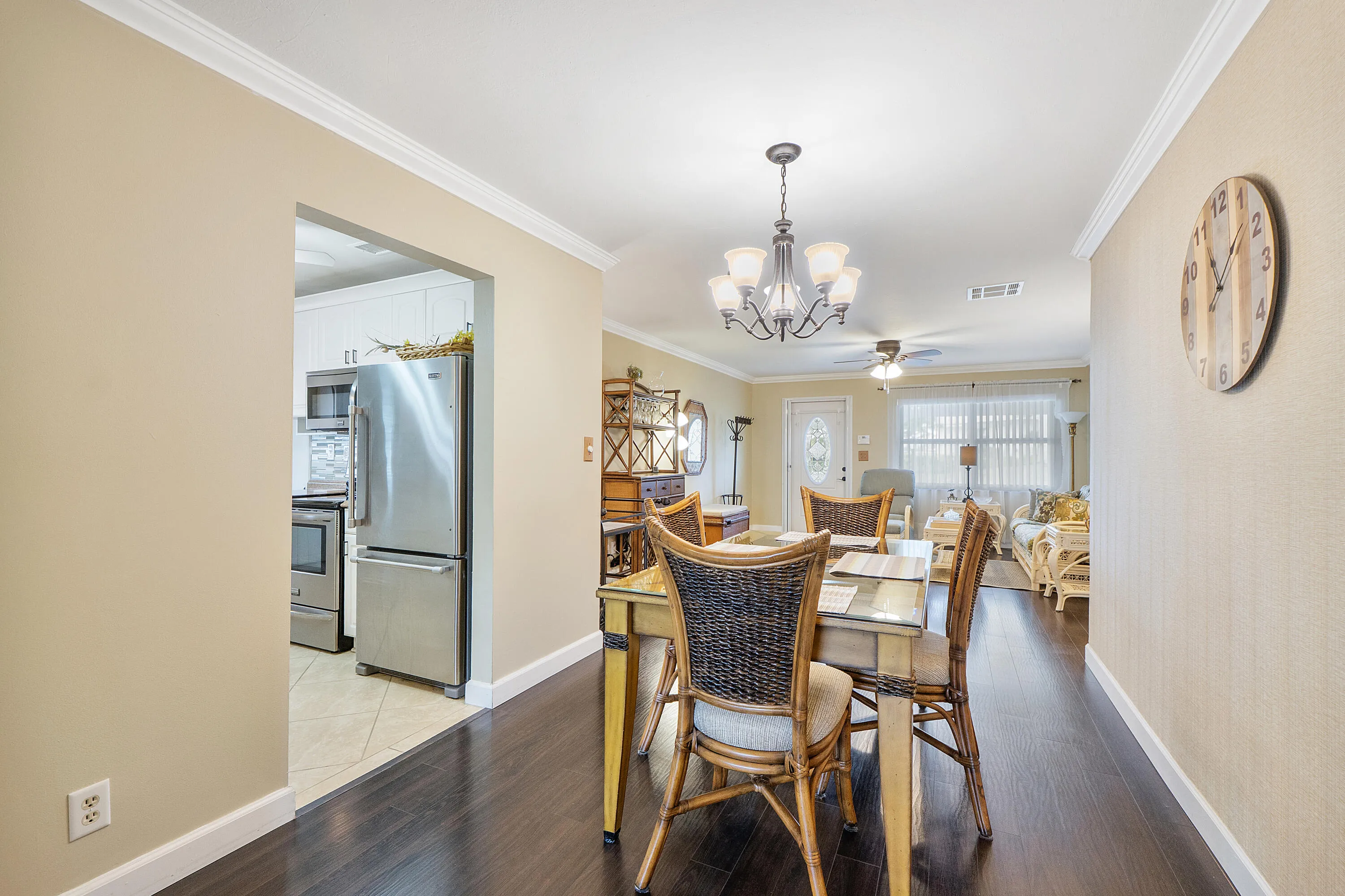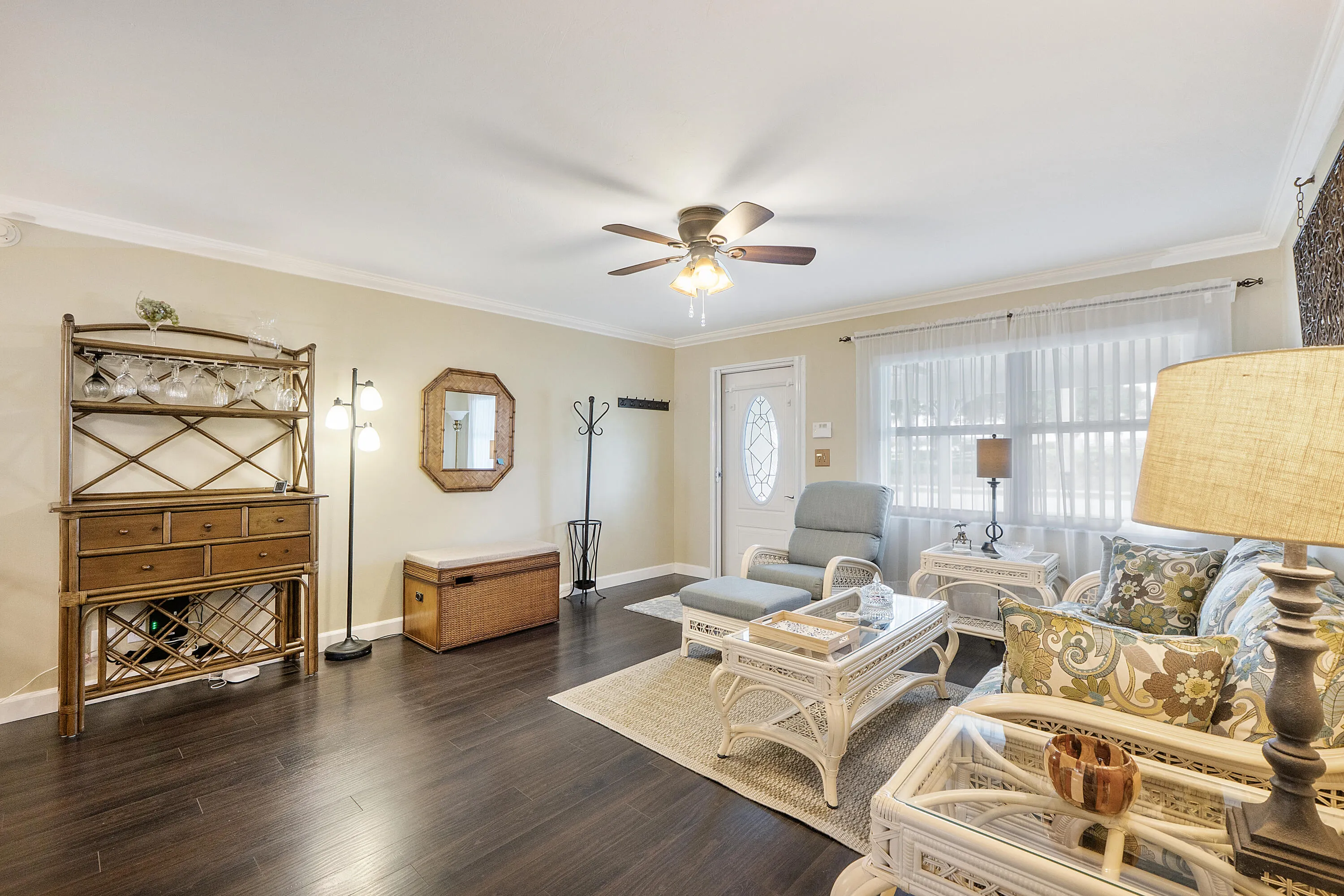 Updated, pristine bright and airy. Updated kitchen and baths, polished tile throughout, picturesque back yard and inviting front porch to sit and enjoy greeting neighbours and the Gulf stream breezes.Enjoy your picture perfect 2/1 in PBl with all the association has to offer including 3 Clubhouses, 3 pools, whirlpool/spa Free 18 hole golf par3, fitness center, numerous social activities. Close to beaches, restaurants and shops. Low HOA of $175.00 – includes exterior house painting every 6 years, power washing exterior every two, lawn maintenance.Rec lease paid up.