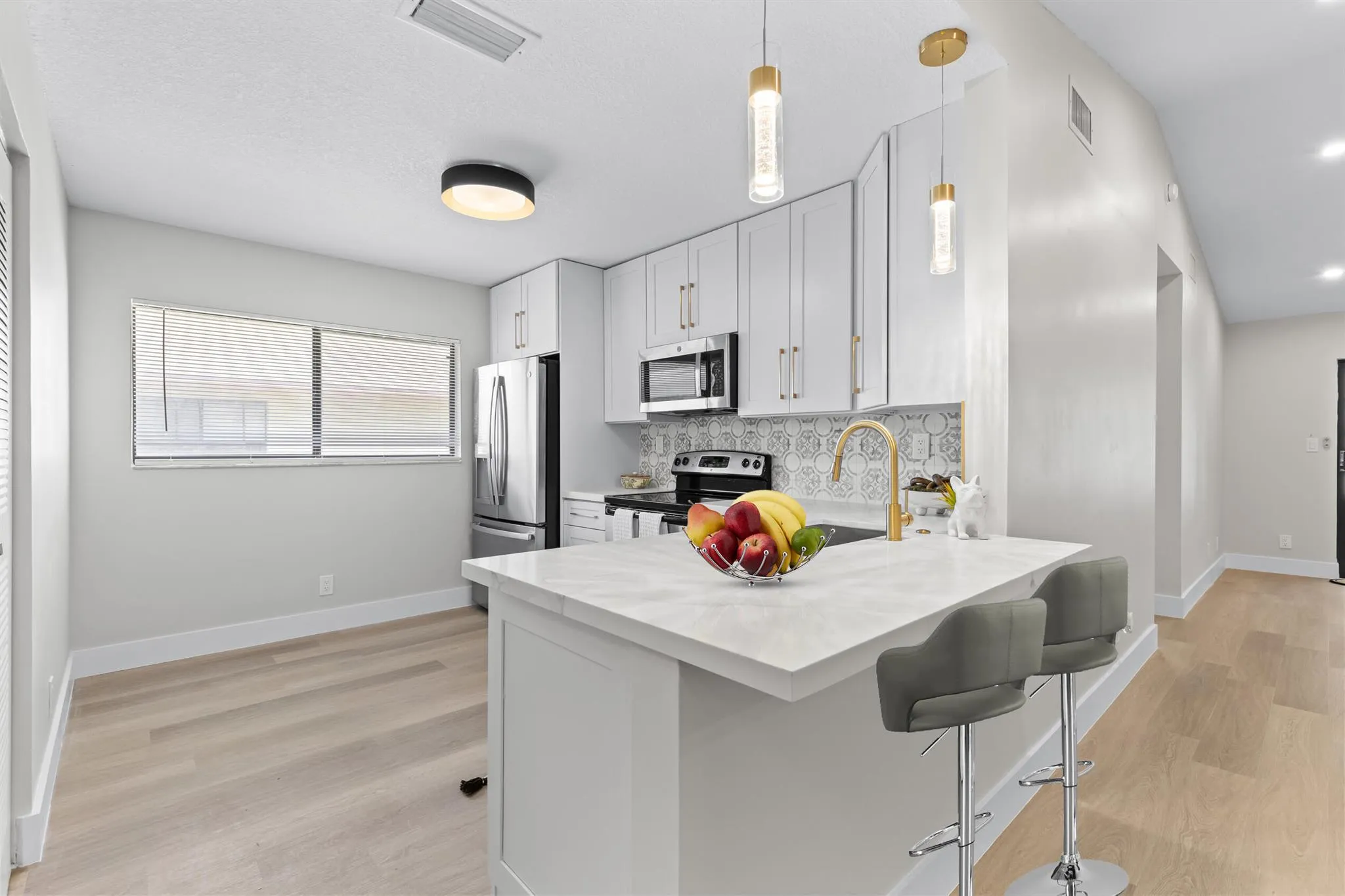 STUNNING, FULLY REMODELED 2ND-FLOOR CONDO WITH LUXURY FINISHES!This one-of-a-kind unit boasts a gorgeous open-concept design with a quartz island and extended bar area, complemented by stainless steel appliances and gold lighting & fixtures for a modern touch. High vaulted ceilings with LED flush lighting illuminate the main living areas, creating a bright and spacious feel. Enjoy the convenience of a separate laundry room with full attic access, a dedicated office space, ample storage, and sleek quartz countertop Elegant flooring flows seamlessly throughout the home adding a designer touch.Spa-like bathrooms feature oak vanities with quartz countertops and large-format custom tile for a sophisticated and relaxing ambiance.