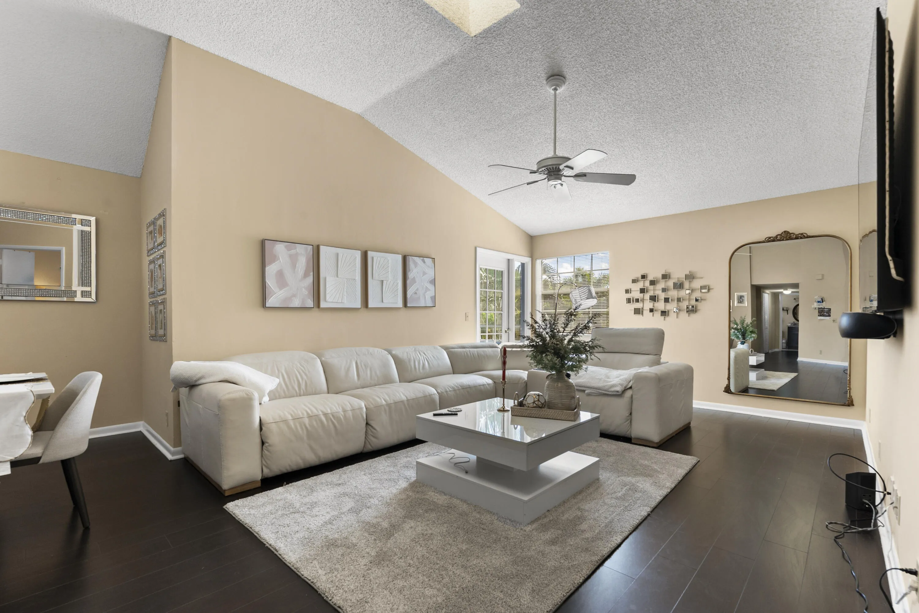 Experience modern luxury in the heart of Boca Raton. This stunning 2-bedroom, 2.5-bathroom townhouse in the gated Majorca community has been meticulously renovated w/high-end contemporary finishes, including Mirage wood floors & bright, smooth-finished walls. Main level features an open-concept kitchen w/sleek quartz countertops, stainless steel appliances, & a breakfast bar, flowing seamlessly into a light-filled family room. Expansive windows & vaulted ceilings in the living & dining areas create an airy, voluminous feel. Upstairs, both oversized bedrooms serve as private retreats with en suite bathrooms featuring floating vanities and frameless glass showers. Embrace the South Florida lifestyle in your private backyard or the screened lanai. Majorca offers heated pool & spa on the lake Location: Walking distance to Boca Town Mall, Walgreens and all the conveniences. Minutes to I-95