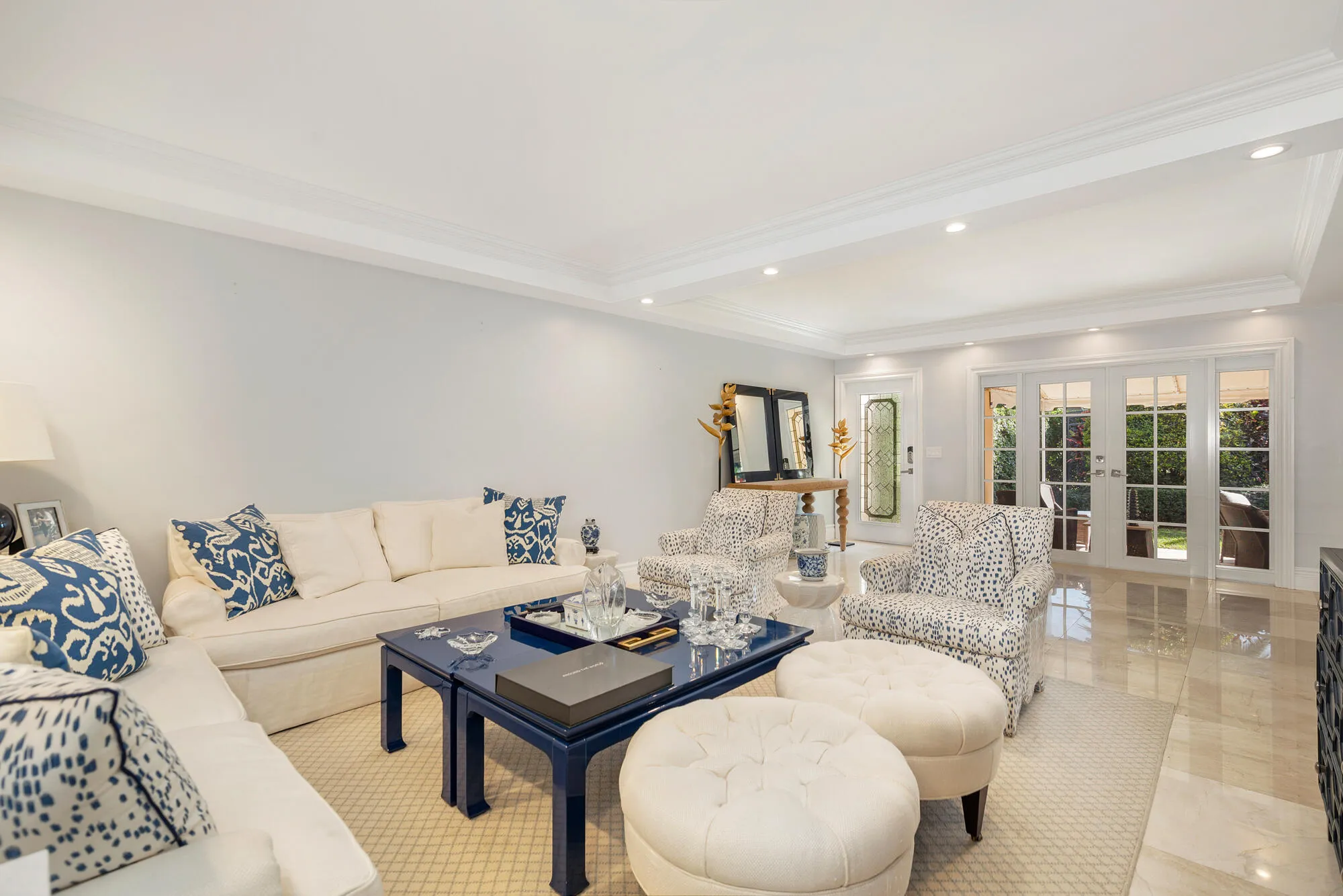 The renovated chef’s kitchen features high-end cabinetry, premium appliances, marble countertops, a sleek glass backsplash, and a convenient wine cooler. Marble flooring flows throughout the main living areas, enhancing the home’s refined sophistication.