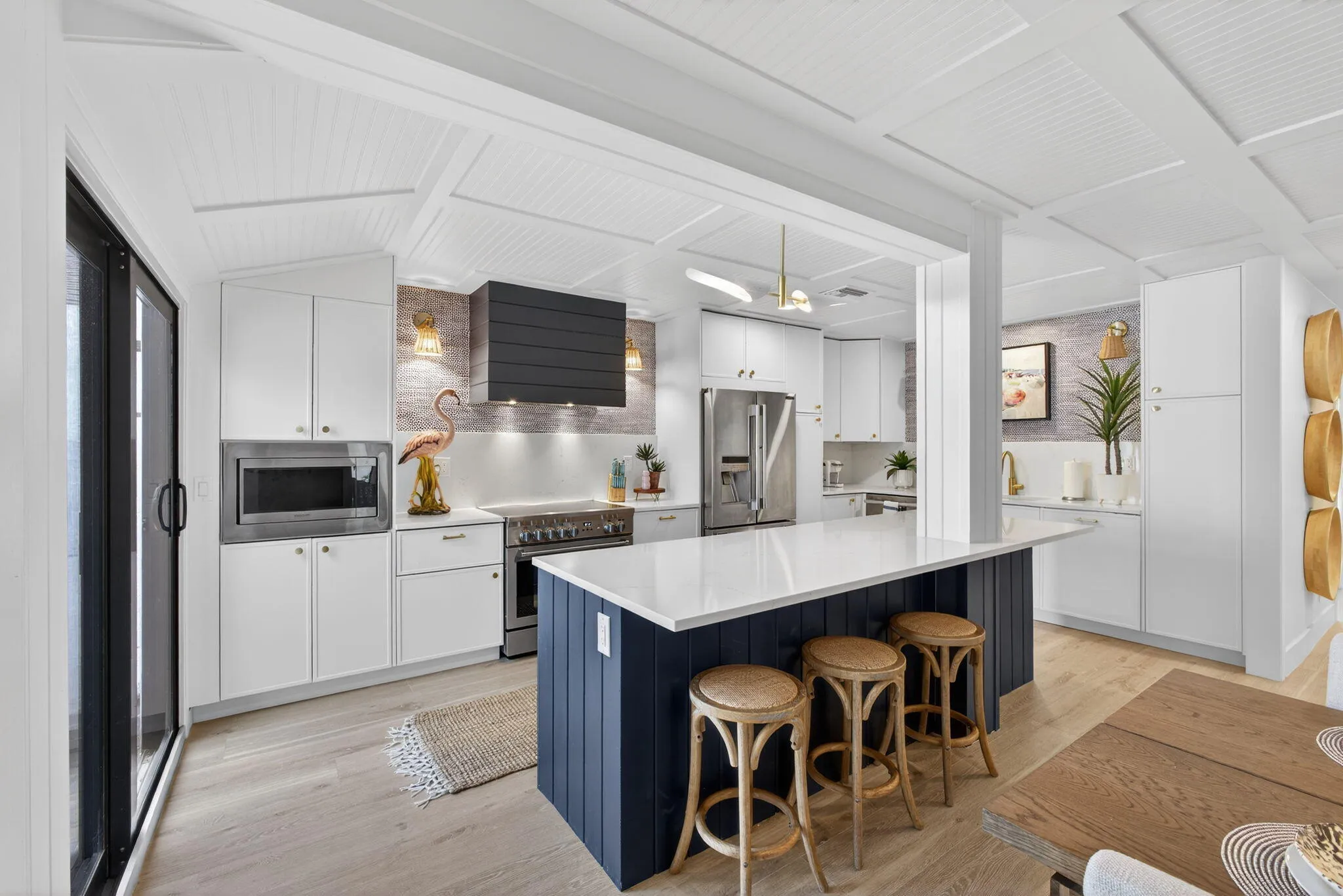 Impact windows provide protection and peace of mind, while newer AC units and updated light fixtures reflect the care and attention this home has received over the years. A solar electric system with bi-directional metering and a Tesla Powerwall home battery backup delivers energy efficiency and added resilience. The covered patio and generous outdoor space create the perfect setting for entertaining or unwinding after a day at the beach.
