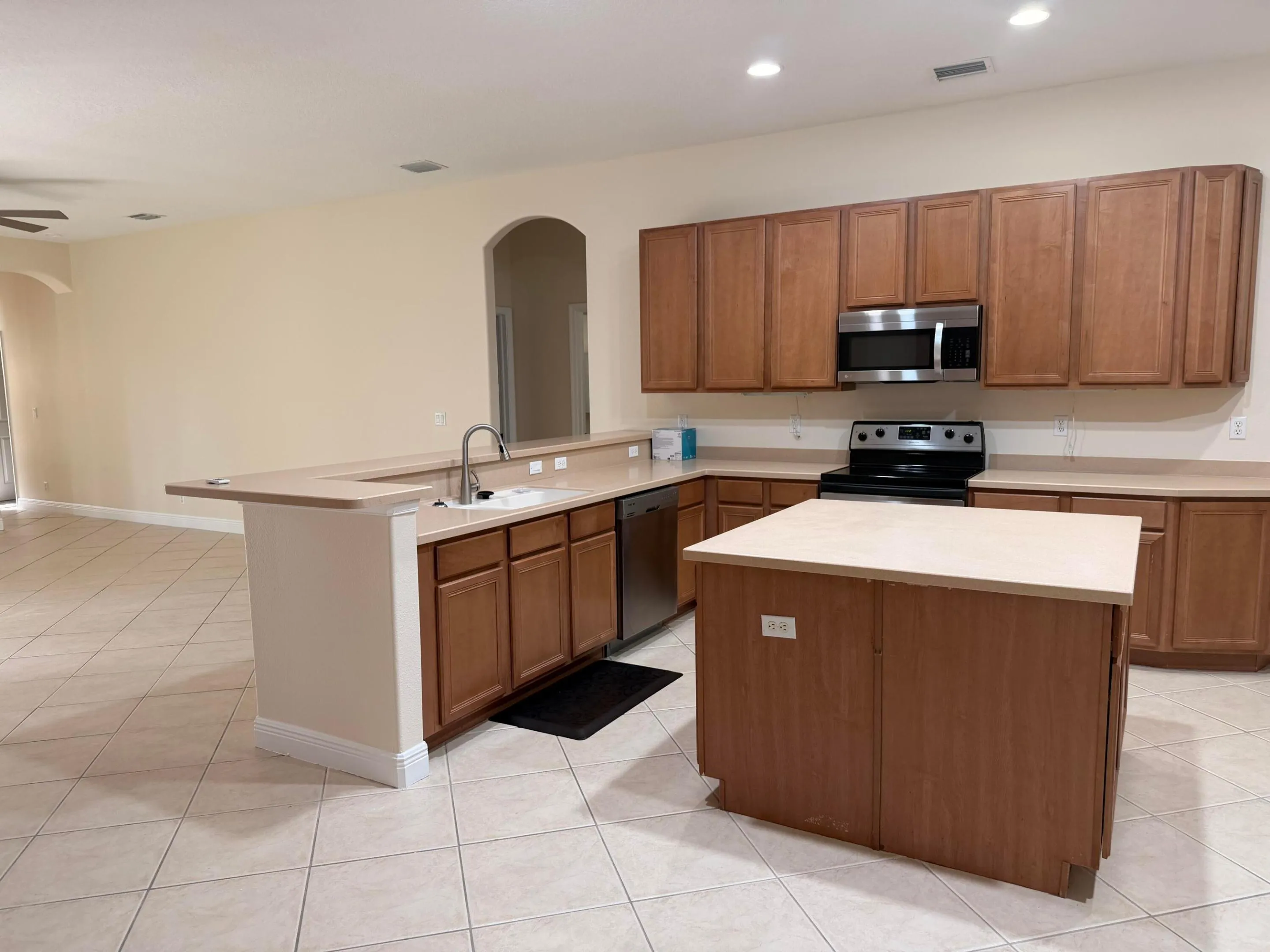 NEW Kitchen in this single level CBS home in the gated community of Springtree recently finished a gorgeous kitchen renovation. The new kitchen features new two-tone (gray and white) cabinetry, new quartz countertops and all new stainless steel appliances. The split floorplan has 3 bedrooms (all with new modern flooring) 2 full baths, and a 2 car garage. Accordion shutters for window protection, located on a large corner lot with a nice-sized backyard with lawn care included in the rent!