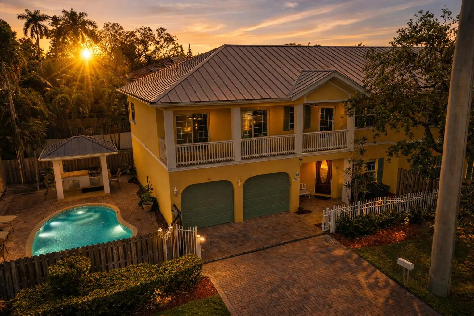 Big 3-bedroom, 2.5-bath townhome with automatic gate & 2 car garage that lives like a single-family home with direct access from your unit to the pool and outdoor kitchen and grills. The home has a Gas range, stainless steel appliances, granite countertops, solid wood cabinetry, and both wall and convection ovens. The expansive living room offers high ceilings and fireplace, creating a warm and inviting atmosphere. Office / den or playroom off the kitchen. The generous primary suite includes a walk-in closet and a full-length balcony overlooking the water, offering beautiful sunset views. Additional highlights include second-floor laundry, a two-car garage, metal roof, impact windows, plantation shutters, marble and wood flooring and more. Come check this unique townhouse out today!