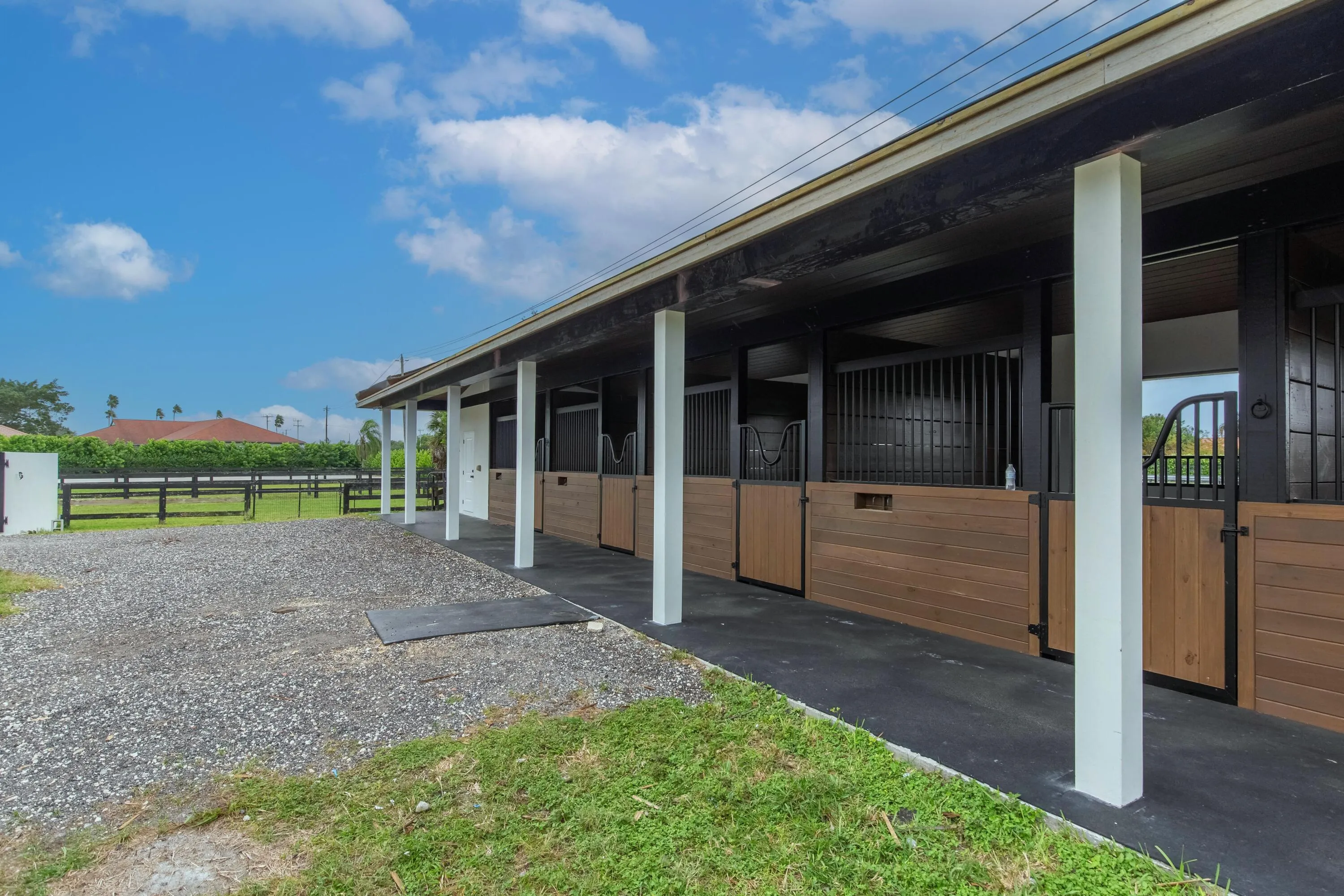 Beautifully renovated equestrian farm and house available for off season or annual rental! Pricing – $1,200 per stall per month for the off season. $2,000 per month for the 2 bedroom barn housing. $15,000 per month during off season for the 4 bedroom newly renovated house. The main barn features 7 spacious stalls, while a secondary barn offers 2 additional stalls. Amenities include high-powered fans, an air-conditioned tack room, a professional fly spray system, and two covered wash racks. On-site staff accommodations include a separate 2-bedroom residence, ensuring comfort and convenience for your team. The private, 4-bedroom, 3-bathroom modern turnkey residence offers a serene escape, complete with a heated pool and luxury finishes.