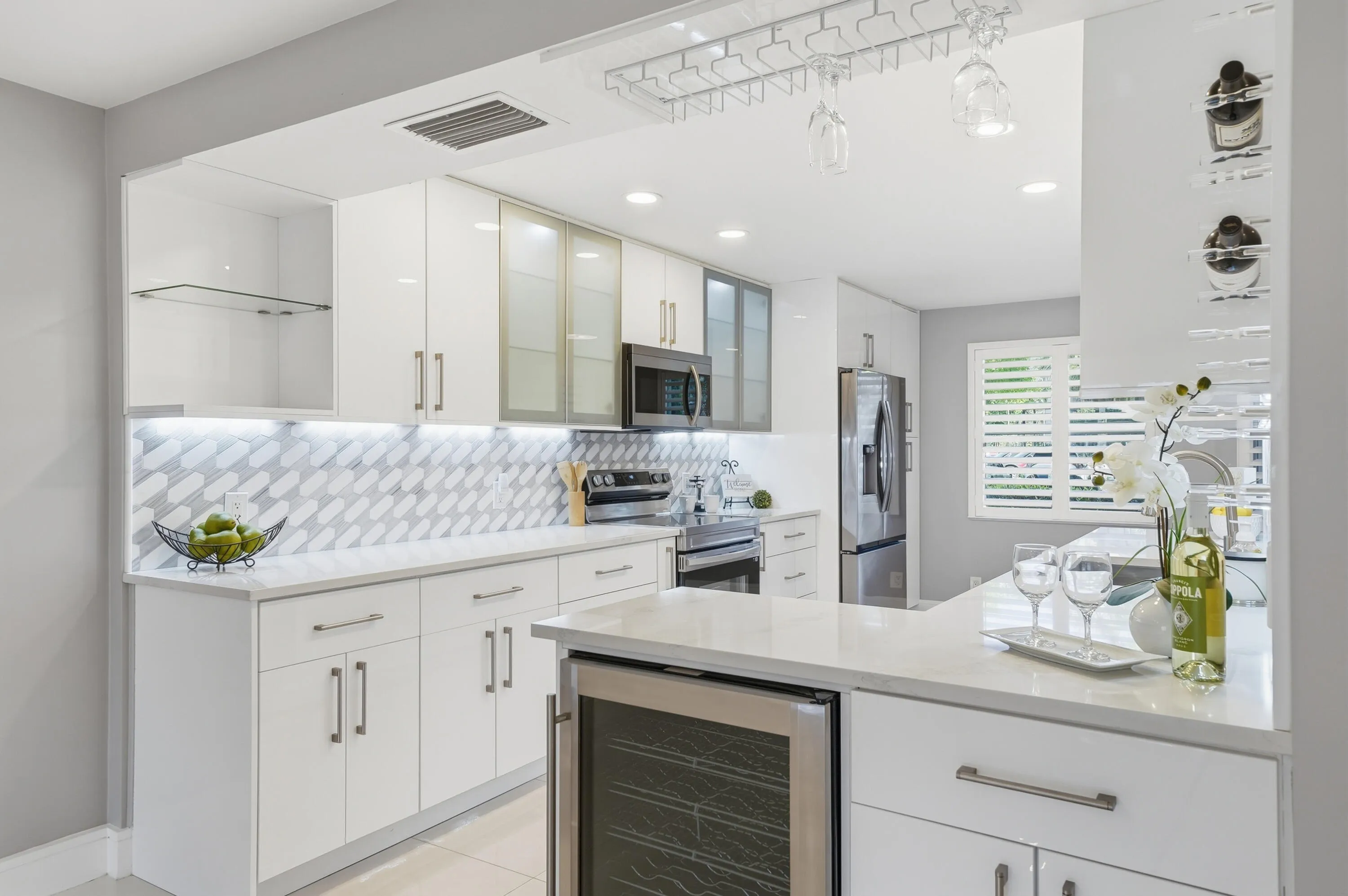 WOW,1 of a kind corner unit on a lake! HUGE Unit! Absolutely stunning w/an upgraded kitchen w/white shaker cabs, Italian Porcelain tile backsplash, Quartz countertops, GE SS kitchen suite. Gorgeous plank Porcelain tile floors in the living areas & luxury vinyl floors in the beds. Newer baseboards are real Pine wood 5.5″. Newer IMPACT WINDOWS AND FRONT DOOR. Both bathrooms have been upgraded& new electrical outlets. All new HIGH END interior doors. This beautiful unit is light bright and airy with WINDOWS all along the side giving loads of light in each room. Enclosed patio could be an extra room. This is a Golf Course Comm w/ many clubs, fitness center, theater, tennis, pickeball. Roof is less than 2 yrs old, getting new catwalk, NO ASSESSMENTS!
