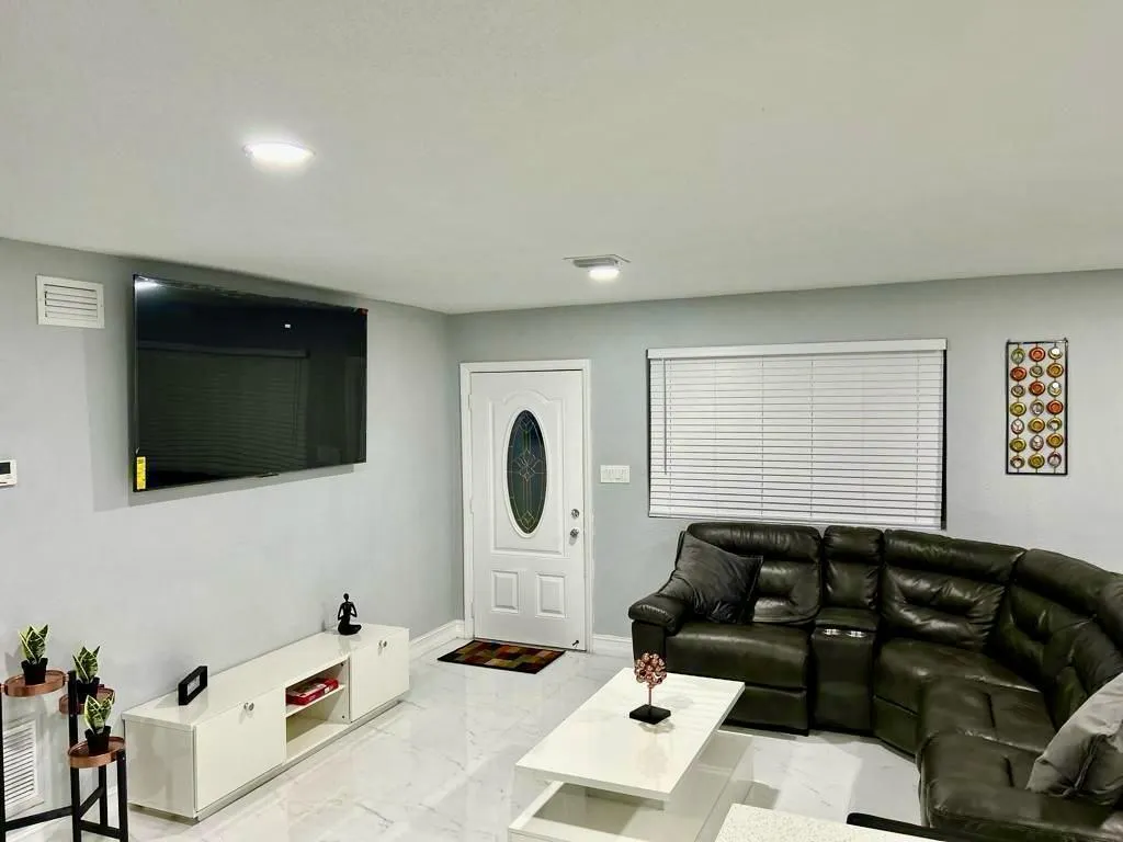 Beautiful newer construction home featuring 3 bedrooms + flex rm (easily converted to 4th bed w/closet), 3 full bathrooms, and a 2-car garage, all in a desirable split-bedroom floor plan. This property can be purchased fully furnished & turn-key, as it is currently operating as a successful income-producing mid-term rental. Enter through double frosted impact entry doors to the open living space featuring full living room, dining room & family room centered around large kitchen with ss appliances, quartz counters, a breakfast bar for entertaining & plenty of storage including a pantry. Large family room opens out to the spacious back patio & private fenced yard. Oversized primary bedroom features 2 walk-in closets & a large double vanity bathroom with separate shower & jacuzzi tub. Two additional bedrooms share a convenient Jack-and-Jill bathroom with double vanity. Additional highlights include full impact windows and doors throughout, & an assumable VA mortgage with a low interest rate – a rare and valuable opportunity. Ideally located near the airport, beaches, stadiums, shopping, dining, and vibrant nightlife. NO HOA