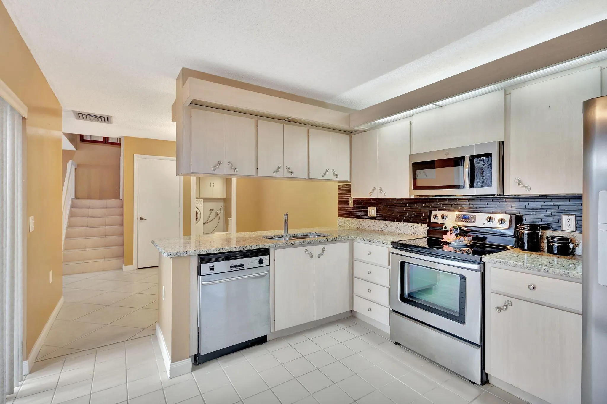 Spacious town home in Stamford of Royal Palm Beach! Hurricane Impact Windows-tinted, granite kitchen counter, all tile floors and stairs, large patio is screened and tiled, new roof, also new gutters, fresh paint exterior. Eat in kitchen, living room and dining room, 1/2 bath w/ laundry room down stairs and 2 spacious bedrooms each with a full bathroom upstairs. Master BR has full sized walk in closet. 2 assigned parking spots for you in front of the building, guests spots throughout the area. Internet is included!Community pool was recently refinished, lovely poolside area with lounge chairs, restrooms, and a shower. Walking distance to schools, shopping and dining.All measurements are approximate.School information was taken from PB county website and to be verified by Buyer. |