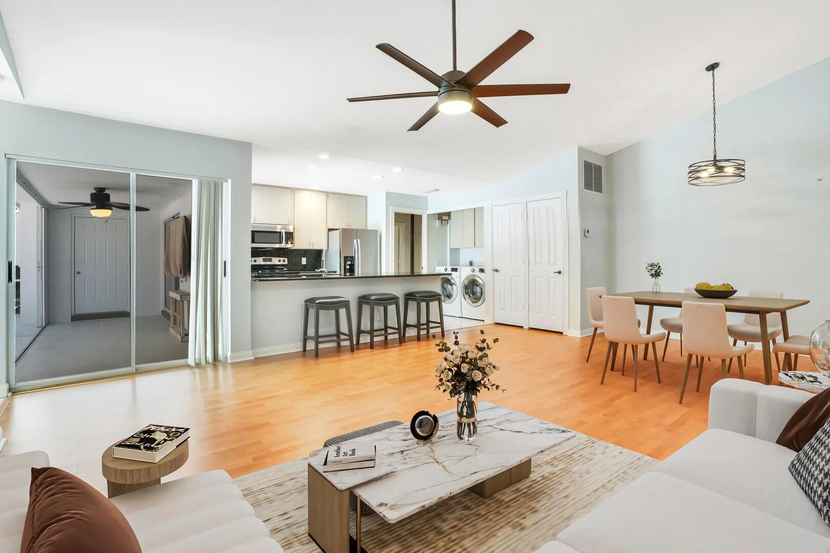 Back on Market! Meticulously maintained Divosta-built villa in the heart of Palm Beach Gardens offering both comfort and convenience. Step through your private courtyard patio into a thoughtfully designed, single-story home featuring a split double-primary suite layout with a neutral color palette. Your updated open kitchen boasts granite countertops, brushed nickel finishes, and SS appliances, flowing seamlessly into the spacious great room. Sliding glass doors in every room bring in the natural light and open to your lush courtyard, for relaxing or entertaining. LG front-load washer and dryer and accordion hurricane shutters add extra peace of mind. HOA covers building insurance, cable, exterior maintenance, and community pool. Located minutes from shops, restaurants and more |