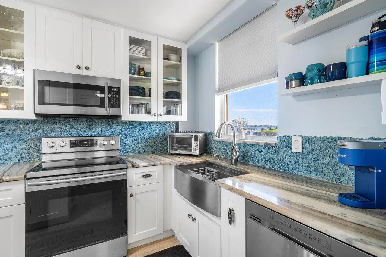 -Welcome to this meticulously updated waterfront condo in North Palm Beach, where luxury meets convenience. The fully renovated kitchen showcases custom cabinets, granite countertops, and high-end stainless steel appliances, creating an entertainer's dream with abundant storage and counter space. Custom pendant lighting adds a touch of sophistication, while the extended layout opens seamlessly to the living area.Natural light floods through impact windows, highlighting the crown molding that graces the common areas and primary bedroom. Both bathrooms have been completely modernized, and stylish vinyl wood-look flooring flows throughout. The primary bedroom and living area offer captivating views of Munion Island, while a spacious 7x25 screened patio provides the perfect setting |