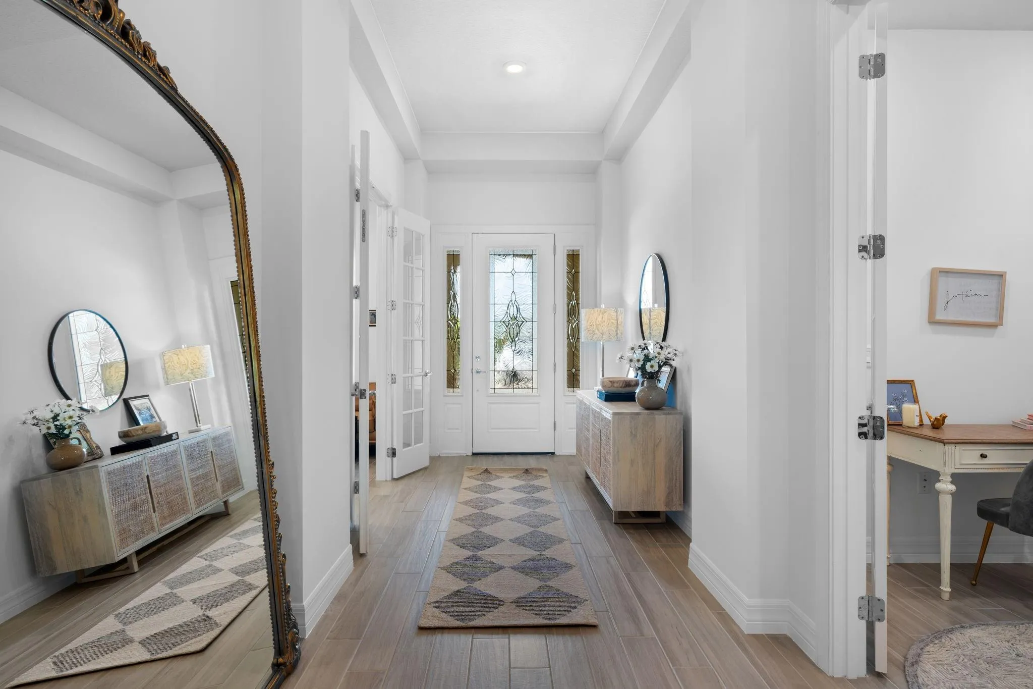 Spectacular and private newly constructed residence sits on a cul-de-sac oversized lot with stunning unobstructed lakefront and preserve views. This Restoration Hardware style home offers 4 bedrooms, 3 bathrooms, a game room, home office, and a spacious 3-car garage with extension and massive driveway. It is professionally designed with exceptional quality features including porcelain flooring, a culinary kitchen with stainless steel appliances, zero corner sliding glass doors, large master bath, tankless hot water heater, and impact windows and doors. The exterior boasts extensive landscape design and lights. The large, screened patio has an extended lanai. Ancient Tree is a gated community, aside from Sandhill Crane Golf Club, close to shops, restaurants and amazing schools. |