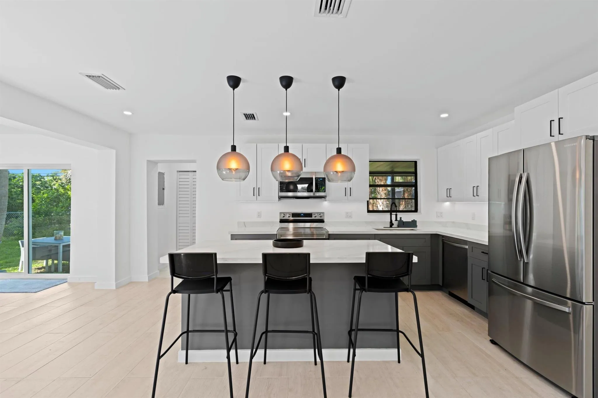 RARE OPPORTUNITY! STUNNING 2023 NEWLY RENOVATED SINGLE-FAMILY HOME ON OVERSIZED LOT IN EAST BOCA RATON! Excellent Workmanship & Materials | Bright Open Split Floor Plan | Porcelain Floors | LED Recessed Lighting! Huge Eat-Kitchen | White Wood Cabinets | Quartz Counters | NEW S/S Appliances | Center Island! Tropical Lush Fenced Backyard | Screened Patio! Impressive Master Bedroom | Large Closet | Ensuite Dual Sink Vanity & Glass Shower. Front Loader Washer & Dryer. Large Driveway. Immaculate & Manicured. Landscaping. Bike to Beach! Minutes to FAU, Mizner Park,, Royal Palm Plaza, I95 & Atlantic Ave! PRESENT ALL OFFERS! Roof 2006. |
