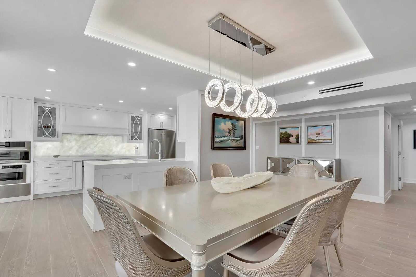 Experience breathtaking, cruise-ship-like views from this stunning 3-bedroom corner unit condo in the highly sought-after Jupiter Harbour. Completely renovated (finished 2023) by a professional designer, this luxurious unit boasts custom cabinets, porcelain tile floors, quartz and stone countertops, and high-end Fulgor appliances, warming drawer, oven, refrigerator, wine fridge, and a custom backlit stone backsplash. Elegant millwork, designer fixtures, ambient lighting, upgraded hardware, all-new electrical, and HVAC ductwork elevate the space. Full hurricane protection- impact glass, roll-down shutters, and manual sliders. Jupiter Harbour offers a 24-hour manned gate, marina, tennis, pickleball, a waterfront walking trail, and a resort-style pool. Walking distance to restaurants/shop |