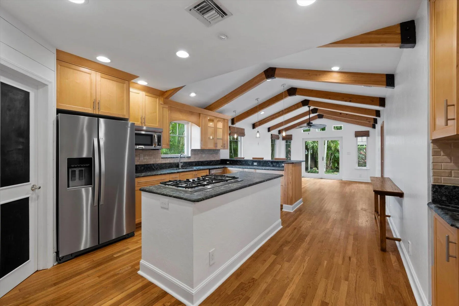 Welcome to this charming home at 729 Biscayne Drive in West Palm Beach's historic Flamingo Park district, where warmth and character greet you at every turn. This exceptional property features an open floor plan that seamlessly connects the kitchen and great room. Vaulted ceilings with grand wood beams and metal brackets create a striking focal point. The kitchen is a chef's dream, boasting custom wood cabinetry with glass doors, stone countertops, a gas stovetop, stainless steel appliances, and ample space for entertaining. |