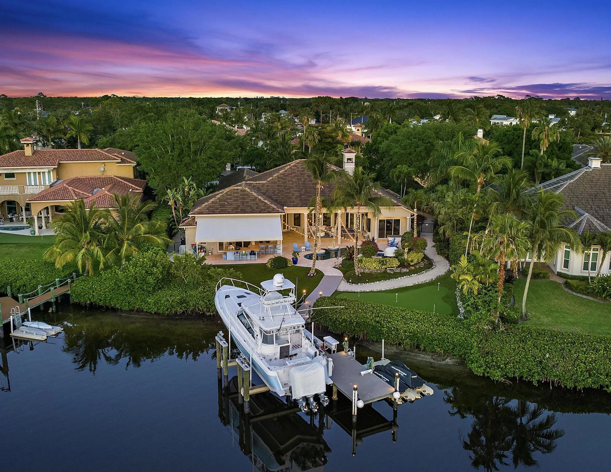 A boater's and entertainer's dream home! Experience waterfront luxury living with over 100 feet of Loxahatchee River waterfront! This stunning 4,336 sq ft home, situated on .68 acres, is dramatically updated inside and out. Open the front door into an expansive living room, overlooking a beautiful outdoor living area, complete with a custom pool/spa, expanded outdoor kitchen, turfed yard and putting green, and a recently rebuilt dock complete with a 40k lb lift. The primary suite features a split bathroom, whirlpool tub and sauna, and newly built out dual walk-in closets. With an updated kitchen, 2020 roof, refreshed guest rooms, and brand new beautiful climate controlled wine storage, this home truly has it all. Ocean/restaurants just a short boat ride away. Can be offered turnkey. |