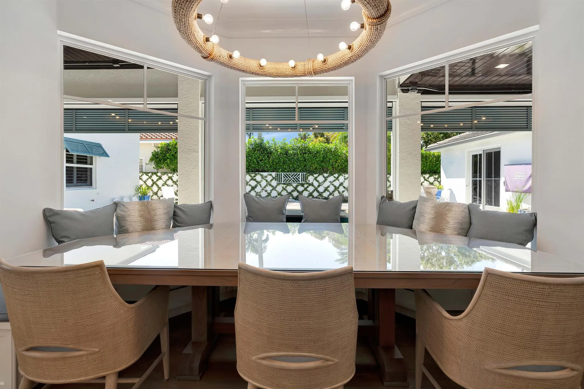 Experience luxury living in this exceptional 4-bedroom, 3.5-bathroom residence, meticulously renovated to showcase sophisticated coastal elegance. This exclusive home is nestled within the Admirals Cove Golf Village community with only 120 homes, overlooking a large tranquil lake with fountain and the first hole of the West course, creating a perfect setting for relaxation and entertainment. Features include high-end appliances, impact doors and windows, custom wine & coffee bar, a full home generator, and advanced security systems that ensure convenience and peace of mind.Every room offers captivating views of the courtyard pool and spa with water features, inviting you to indulge in year-round or seasonal enjoyment. |