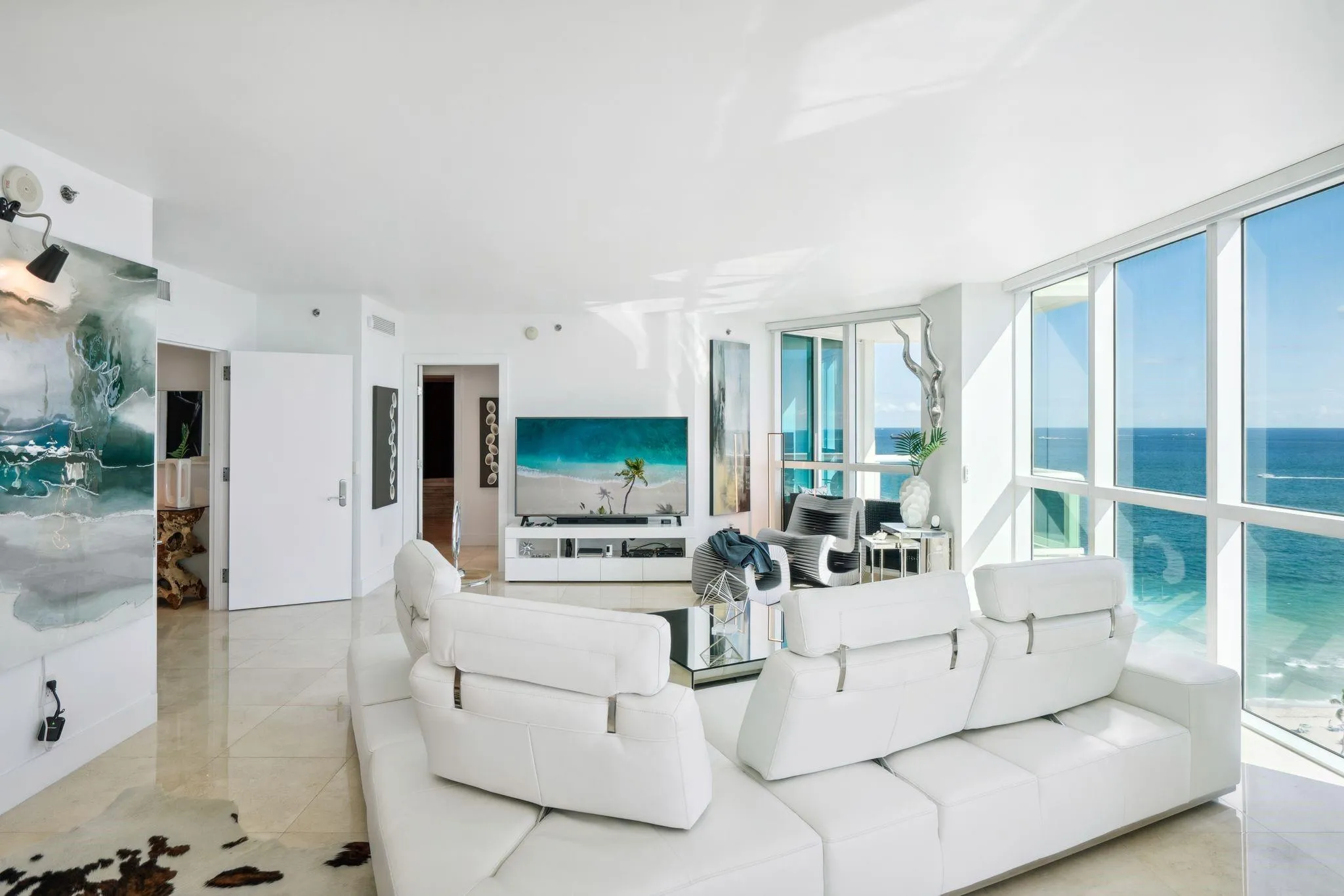 Breathtaking turn-key corner residence with panoramic views of the ocean, intracoastal, marina, city, sunrise, and sunset. Sought after address - where Las Olas meets the beach. Oversized 2/2 residence + 2 Balconies, water views throughout from the moment you step off the private elevator. Open floor plan ideal for entertaining, Luxuriously appointed with floor to ceiling windows & doors and marble floors throughout. Top of the line Miele and sub-zero appliances. Primary suite with private balcony, stone clad bathroom, dual vanities, separate soaking tub and shower, and custom walk in closet. 250' on Fort Lauderdale beach, resort style amenities: 24/7 concierge, fitness center, saunas, clubroom, game room. Heated swimming pool, oversized hot tub, fountains, poolside bar, and cabanas. |