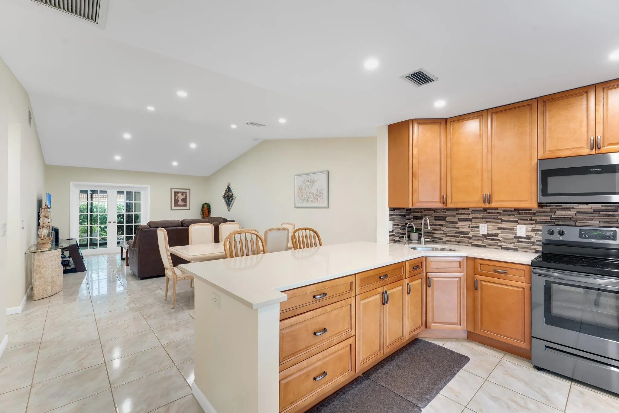 Welcome to this beautifully updated villa in The Arbours II a 55+ community! From the moment you walk up the marble brick path and into the private, fenced front porch, you'll feel right at home. Inside, vaulted ceilings and tons of natural sunlight make the space feel bright and open. The layout has been completely opened up for true open-concept living, featuring new high hat lighting and a stunning custom kitchen with quartz countertops, soft-close cabinets and drawers, ceiling-height storage, and brand-new appliances.Both bathrooms have been fully remodeled with stylish tile work, new vanities, and modern illuminated mirrors. There's plenty of space for dining--whether it's at the snack bar or in the separate dining area. |