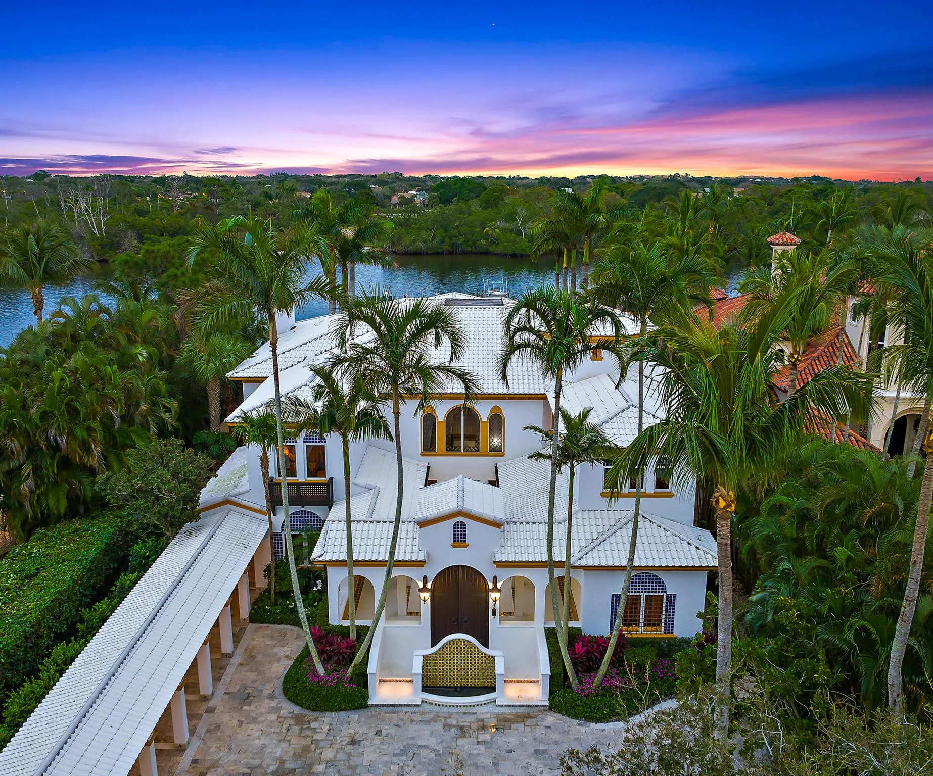 Step into luxury with this Moroccan-inspired Intracoastal estate, offering five bedrooms, eight and a half bathrooms, and 7,175 sq ft (10,803 sq ft total) of exquisite living space on .68 acres. With 100 feet of direct waterfront, 200ft of dockage, deep water access, and no fixed bridges, boat lift, and jet-ski lift, it's a boater's paradise near Palm Beach & Jupiter inlets. Overlooking a 24-acre nature preserve, the 2018 remodel includes a new in-law suite, pool cabana, covered porch, balcony, office, two boat lifts, whole-home generator, upgraded pool heater, and state-of-the-art appliances. |
