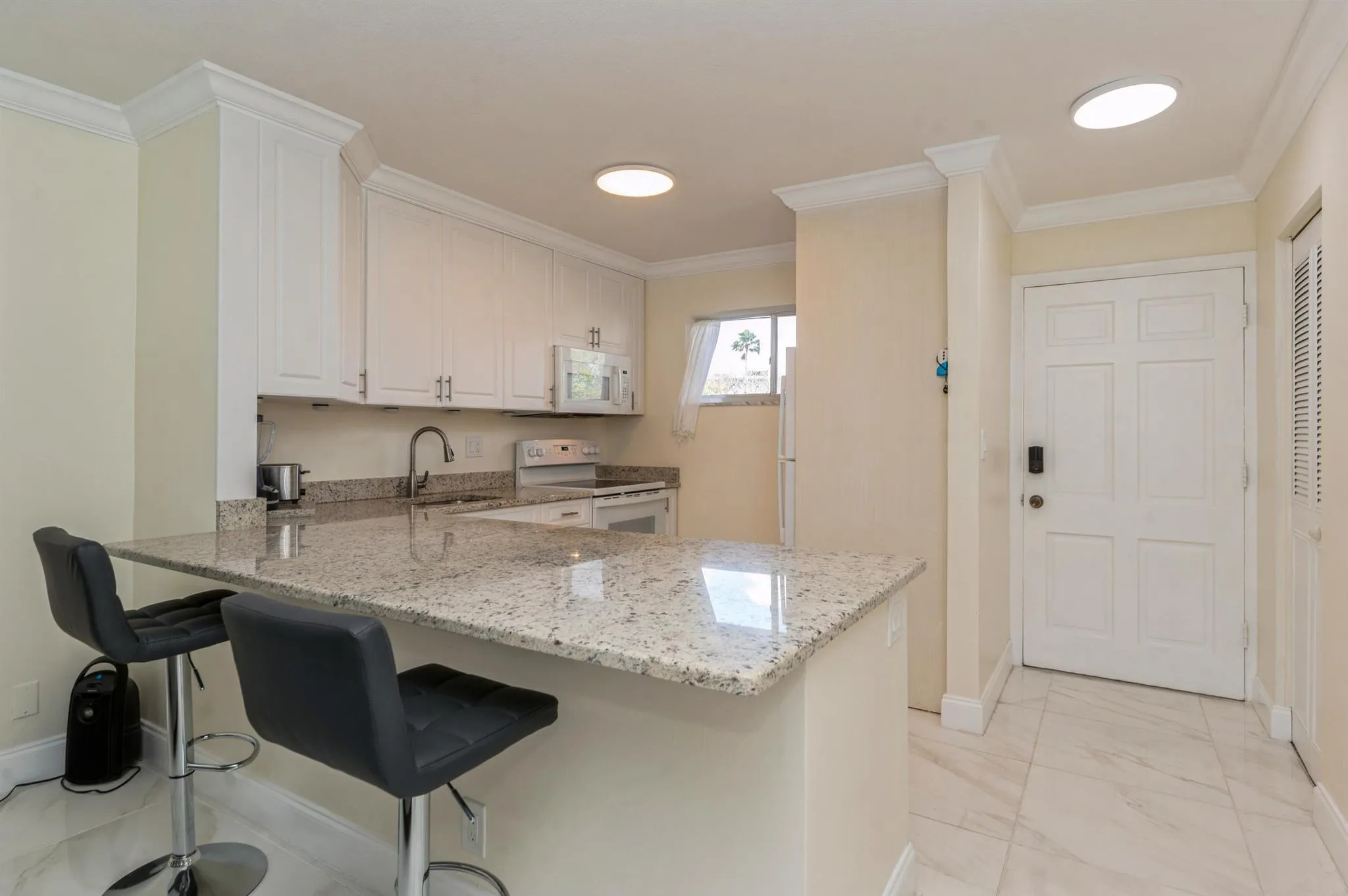 This 1 bed, 1 bath, furnished, 55+ condo is an absolute steal. Special assessment paid up. Beautiful water views from the living room, bedroom and the sunroom. The sunroom overlooks the water and is directly accessible from the bedroom; a great place to relax in peace and quiet. With front and back doors, access to this 1st floor beauty is very easy. Your kitchen, finished with granite countertops and upgraded white cabinetry, is completely open to the living area. The upgrades continue in the bathroom with a granite vanity and a stylish walk-in shower. The entire apartment has tile underfoot and crown molding everywhere. Other great features include new living room furniture, an adjustable bed, a walk-in closet, new AC ducts, new AC motor 2023 and motorized blinds. Totally move-in rea |