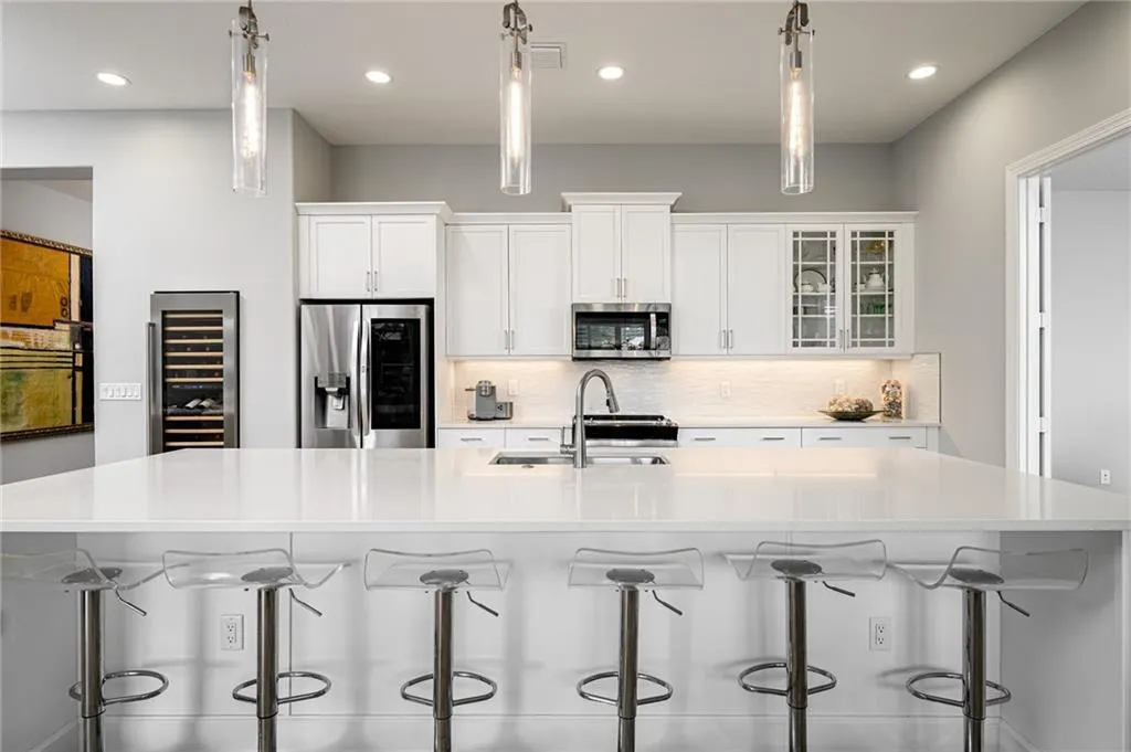MOTIVATED SELLERS!! This immaculate lakefront pool home is sheer perfection, 3 bedrooms plus a den, overlooks a private lake with a large waterfall and bubbling water feature with a sundeck. The sound of water fills the open concept home. The Kitchen has an enormous marble island with seating for 6, plenty of room to sit and sip wine from your built-in wine frig. Large primary suite with water views and generous walk-in shower. Spotless 3 CAR GARAGE with Epoxy floor and upgraded rear extra storage area is every man's delight. This home is a must see and it's absolutely gorgeous. |