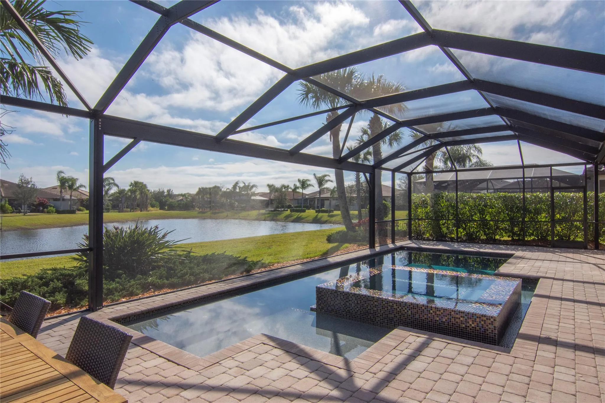 Hit the "LOVE" button for this one! It's the original builders' model with ALL the upgrades and more! The main living areas feature a gourmet kitchen with KitchenAid appliances and wood tile flooring. The stunning, one-of-a-kind heated pool and spa features panoramic screening overlooking the lake. The extended garage makes it an actual 3-car garage with plenty of space for storage. Best-in-Class clubhouse featuring a fitness center, movement room, card room, gathering room, kitchen and bar. Additional amenities include a resort style pool, pickleball, tennis and bocce. |