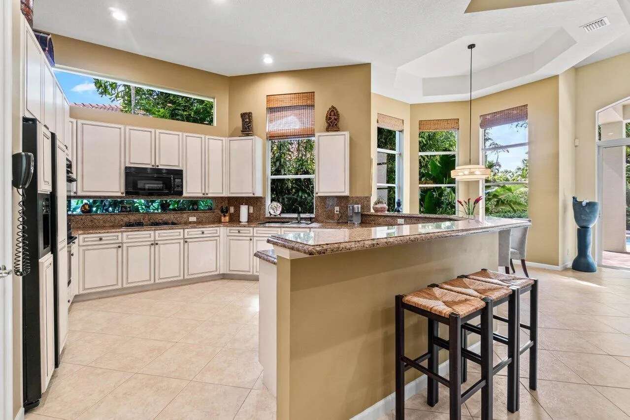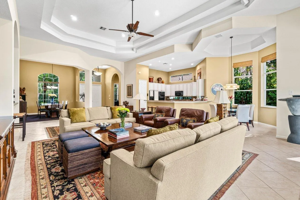 This beautifully designed single-story home is 4 BR plus office / 4.5 BA (all ensuites). Rare in Ballenisles, this home is sold with NO MANDATORY EQUITY MEMBERSHIP requirement - in perpetuity. Golf, Sport, or Racquets equity memberships are available through the club should the buyer desire. Or maintain the present non-equity membership with dining privileges in the main dining room and lounge with no membership fees. Upon entry, the expansive open floor plan immediately impresses with its 15+ foot ceilings and inviting views of the pool and spa set against the backdrop of a lush private backyard. A 2.5-car side-entry garage provides ample space for a golf cart, storage or hobbies. The kitchen is a cook's delight boasting three windows with lots of prep space, gas cooking, granite |