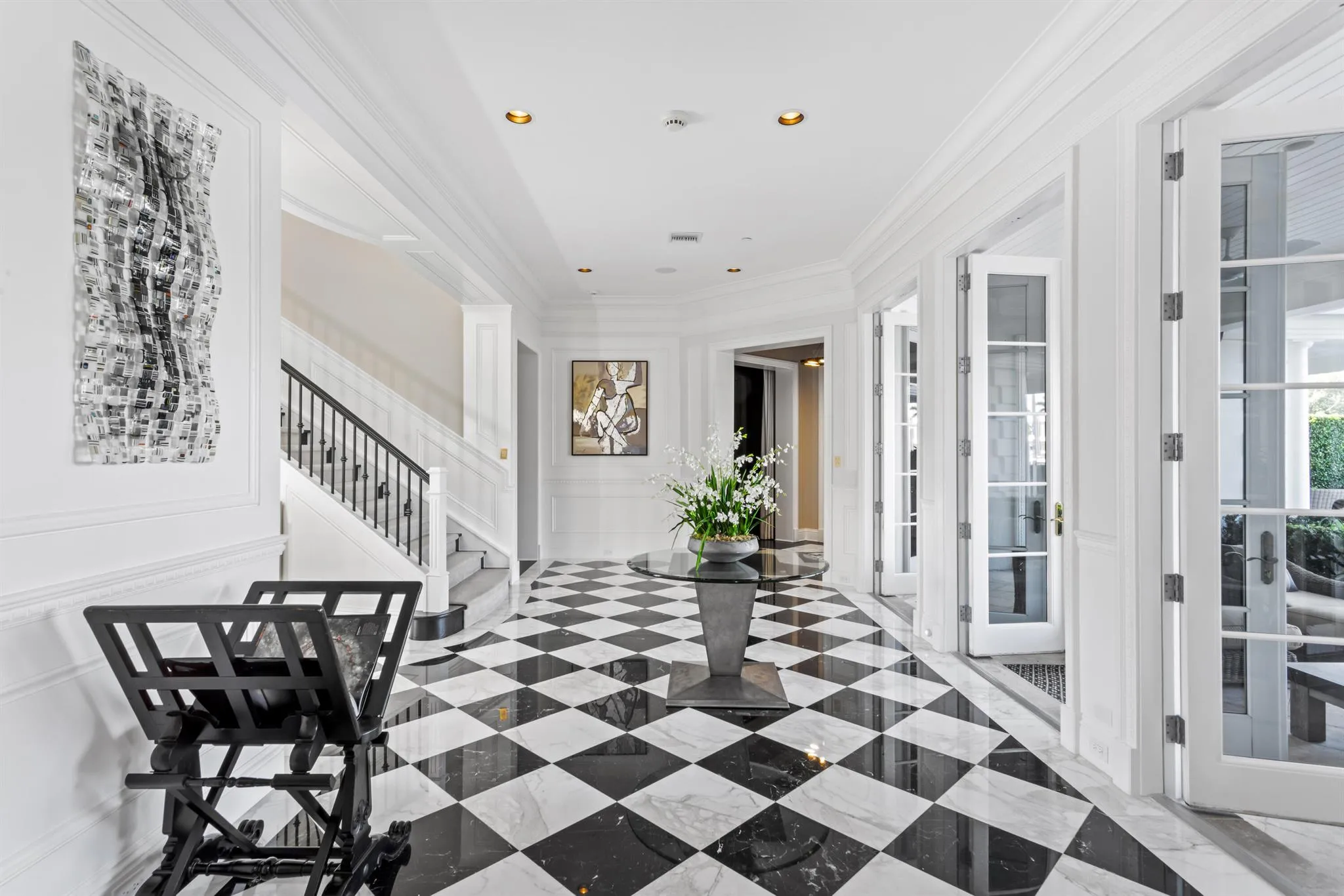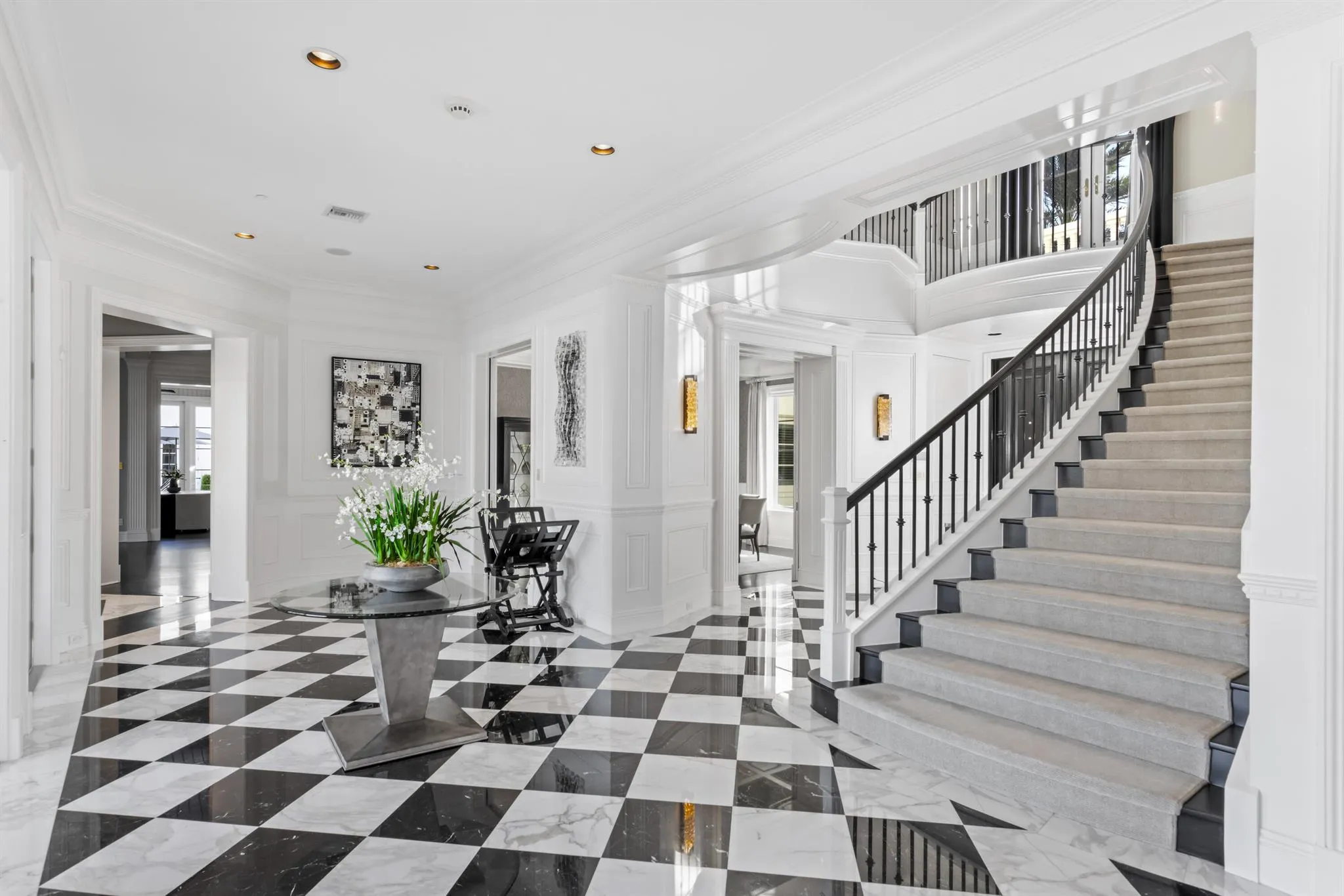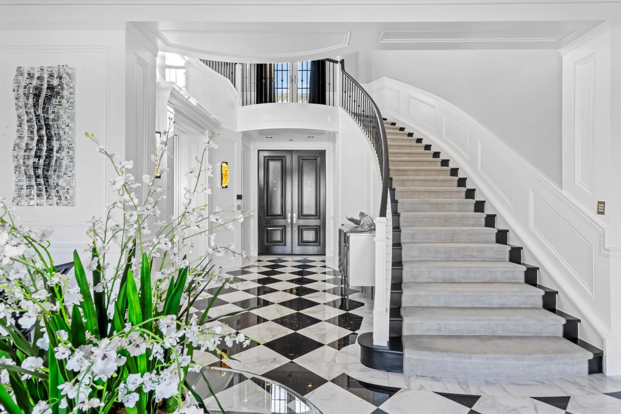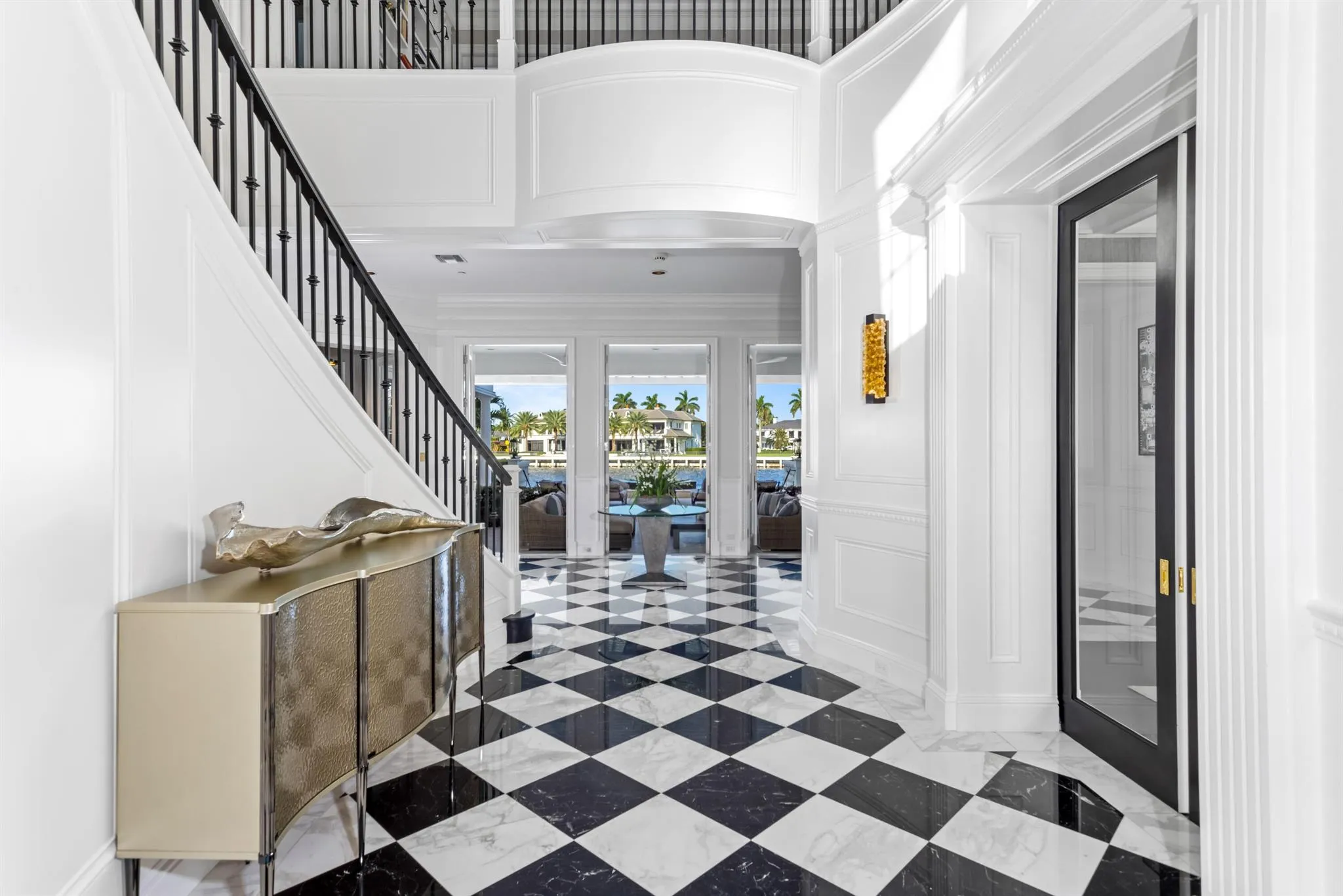 This Intracoastal Compound residing in The Estate Section, is approached on a gated cobblestone drive, surrounded by a pristine landscape complete with topiary and medjool date palms. From its dramatic two-story entry foyer with sweeping staircase to its gleaming patterned stone and ebony-stained hardwood floors, custom moldings and fireplaces, 11'+ ceilings, waterfront balconies and glorious waterway views from all the major rooms, every aspect of this superbly furnished residence speaks to gracious living with modern style and flair. |