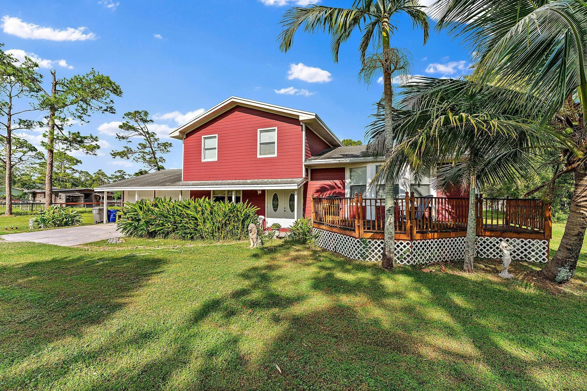 Located in popular equestrian community Jupiter Farms, this tri-level, 4 bedroom, 3 bathroom home sits on an expansive 1.25-acre lot offering privacy and a connection to nature. With over 1,868 square feet of living space and a total of 2,804 square feet, the property combines functional living areas with rustic charm. The layout includes wood and tile flooring throughout and versatile spaces like a family room on the second floor and a cozy living room below.The kitchen features a bartop counter connecting to the dining room, creating a warm setting for gatherings. Updates include a 2015 AO Smith water heater, and dual AC systems for comfort and efficiency. Outdoor spaces are a highlight, with a front deck and a back balcony perfect for |
