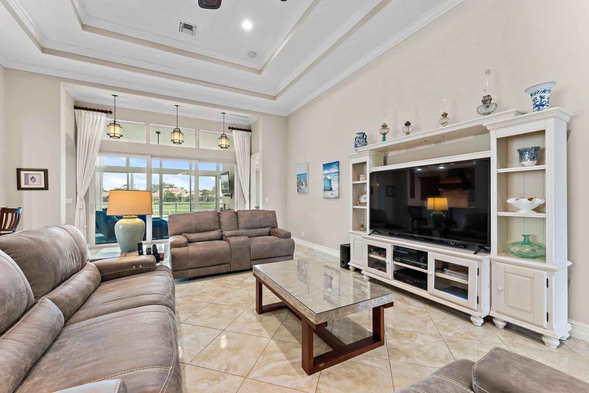 Stunning One of Kind CUSTOM Golf Home in Jupiter Country Club! GOLF MEMBERSHIP is available but not required. This spacious CBS home sits on a Prime corner lot with Lake AND Golf views, bordered by enchanting landscaping. Built in 2013 this Impeccable home features Impact Glass and Energy Efficient Construction! Double door entry leads to a bright + airy great room w/ 12' triple coffered ceilings. Design elements include porcelain tile floors, plantation shutters, solid core doors and crown molding. The kitchen features upgraded wood cabinetry, stainless appliances, custom backsplash and a 5 burner range w/ ceiling vent. A breakfast nook and formal dining room offer a variety of seating options. A cozy sunroom offers additional space for relaxing or entertaining. The primary bedroom is |