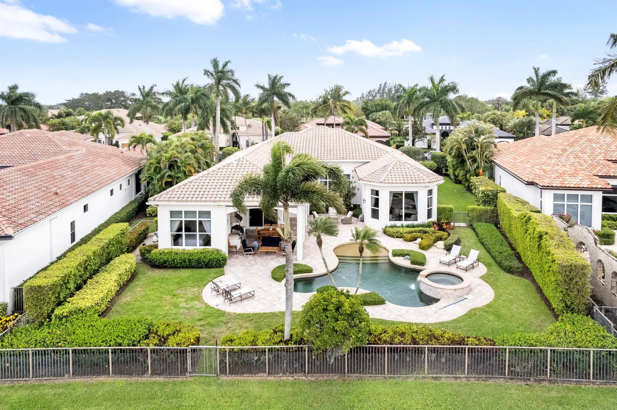 PRIVATE ONE-OF-A-KIND LOT WITH PANORAMIC WATER AND GOLF VIEWS...RARELY FOUND! With over 80 feet of waterfront, this single-level estate features breathtaking WOW views, one of Ibis' best! ! Features include 4 ensuite bedrooms, 4.1 baths, plus a private office/den with all impact glass and doors, soaring ceilings, travertine flooring and neutral decor. The oversized primary suite boasts custom closets and a spa-inspired bath, while the chef's kitchen is equipped with newer Sub-Zero and Thermador appliances. The backyard oasis features a saltwater pool and spa, summer kitchen and remote-controlled phantom screens for seamless indoor/outdoor living. IMMEDIATE PREMIER GOLF MEMBERSHIP AVAILABLE...THIS PROPERTY IS READY FOR THE MOST DISCERNING BUYER! |