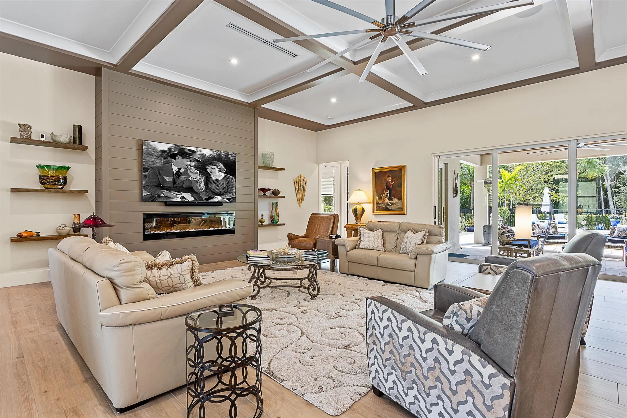 Tucked away on a quiet, one-acre preserve lot, this 2022-custom built home offers over 5,000 square feet of thoughtfully designed living space. It's a full Smart Home, with everything from internet boosters in every room to Sonos audio, built-in security, OVRConnect, and a standby generator for peace of mind.Inside, the home is filled with custom touches--coffered ceilings, beautiful built-ins, and electric fireplaces in both the family room and the primary suite. The oversized three-car garage is climate-controlled and fully insulated with finished epoxy flooring and plenty of room for storage.The kitchen features double islands, quartz counters, top-of-the-line appliances, and custom cabinetry throughout. |