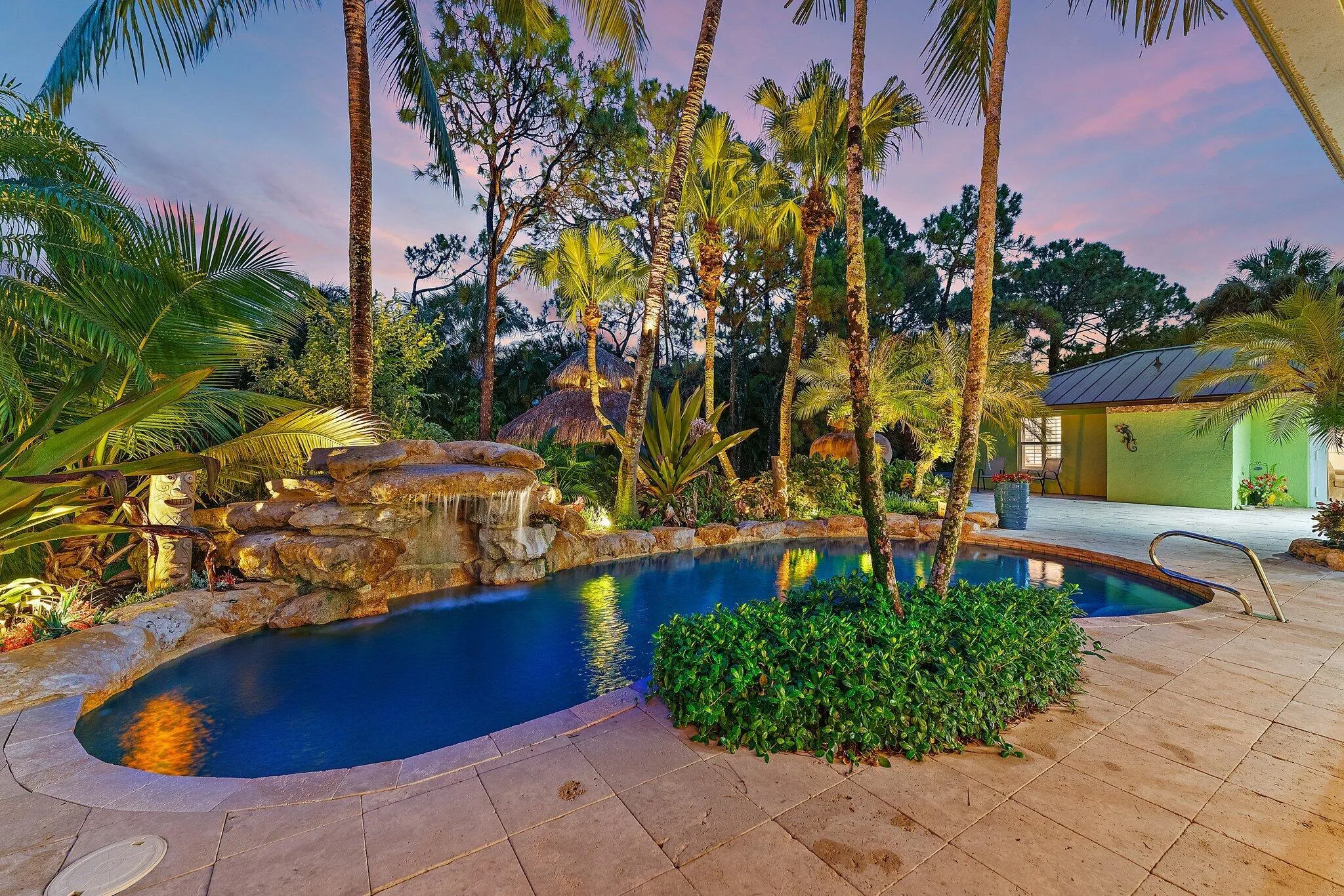 Welcome home to your tropical oasis in the country on 1.15 acres! This spacious property is perfect for entertaining inside and out, featuring a 4 bedroom, 3 bath home and a 1/1 guest house overlooking a stunning rock waterfall and saltwater pool, tiki hut with a gas-lit firepit, gas outdoor fireplace, and a new 1,500 sq ft pole barn equipped with electric for your RV or party hosting needs. This home is ideal for large family gatherings or retreats, boasting a brand-new metal roof, impact windows, whole house generator, two-five hundred gallon underground propane gas tanks, fenced backyard, and two driveways with extra parking for the guest house. The freshly painted interior includes a renovated kitchen with custom wood cabinetry, granite countertops, range hood, cooktop, double ovens, |