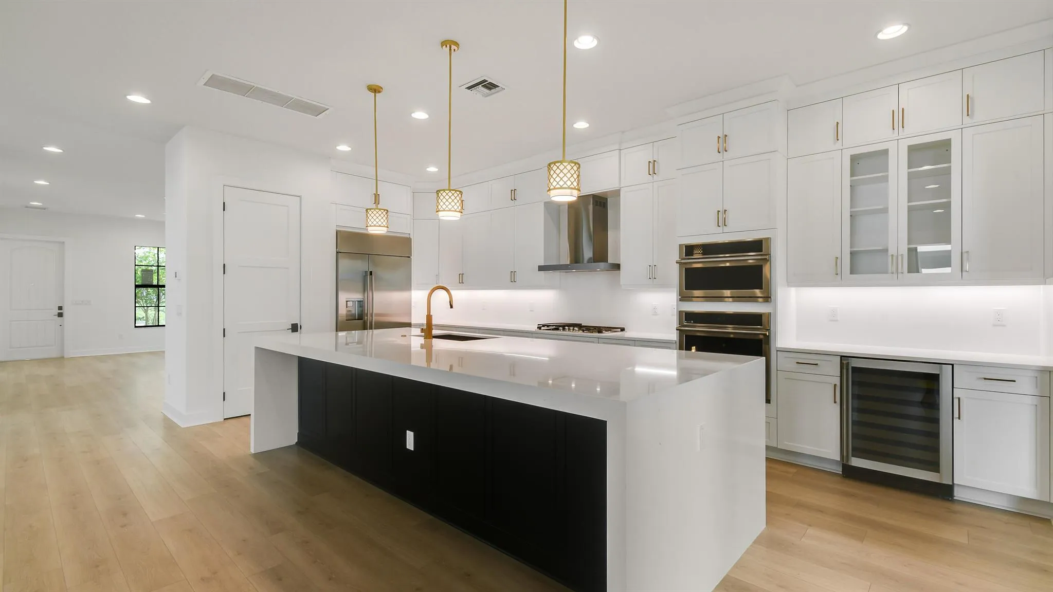 **New Construction - Move In Ready** This brand-new Manchester model is built in Alton's final section, just steps from the clubhouse and Benjamin School. At just under 4,000 sq ft this home features 5 bedrooms 4.5 bathrooms, an enclosed double door office/den, living room, family room, fully upgraded kitchen, second floor loft, built-in outdoor kitchen, an outdoor summer kitchen, and 3 car garage. The gourmet kitchen includes built-in Monogram appliances, gas range, kitchen island with a 3'' edge quartz with waterfall edges, and second tier cabinetry with crown molding. The owner's suite has coffered ceilings, his and hers closets, frameless glass shower, freestanding soaking tub, and private covered balcony. |