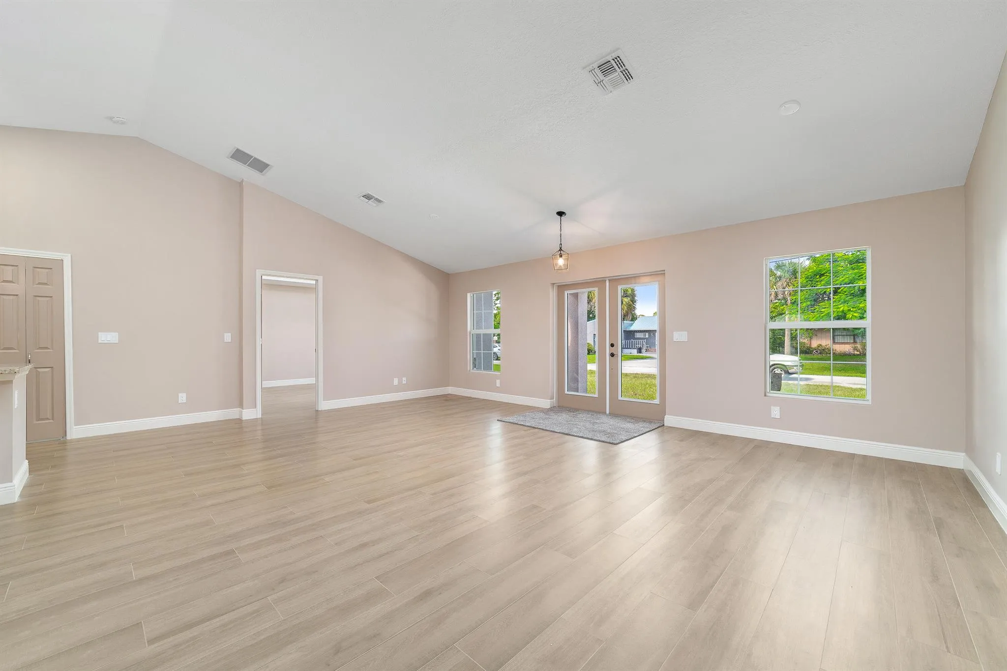 **Brand New Construction**: If you're in search of a four-bedroom, two-bathroom, two-car garage home *without* the constraints of an HOA, this stunning property is the perfect choice! Situated East of US1, this Key Largo Premium model offers several high-end upgrades, including a double-wide pantry, 5 1/4 inch baseboards, a trussed covered back patio, extended double walk-in closets in the owner's suite, and an oversized bathroom that also functions as a cabana bath. Enter through elegant glass double doors into an open floor plan featuring neutral tones, vaulted ceilings, and wood-look tile flooring throughout. The kitchen is a chef's dream, boasting a spacious island, Samsung stainless steel appliances, |