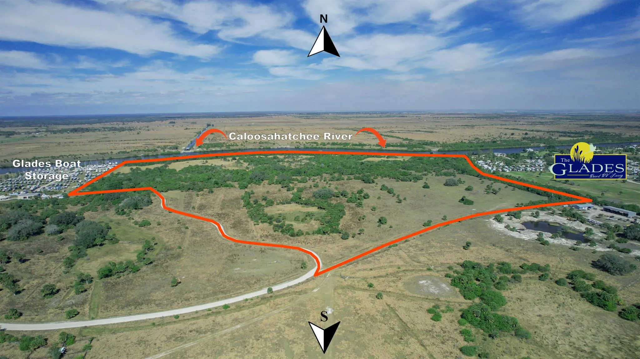 Partial Owner Financing Available with *LOW* interest rate!! One of the largest remaining waterfront properties on the Caloosahatchee River, this expansive 121.9-acre parcel presents a prime investment opportunity with +/- 3,000 feet of water frontage. Offering direct, deepwater access to the Atlantic and Gulf, this property is perfectly suited for a luxury residential community, RV resort, marina, or mixed-use development.Positioned between Glades Boat Storage & Boatyard to the west and Glades RV Resort, Golf & Marina to the east, the site is currently zoned AG/Res but can be easily re-zoned for residential, commercial, or recreational use. The land has been fully graded and backfilled with 200,000 cubic yards of owned fill, with the berm leveled and approved by the USCOE, making |