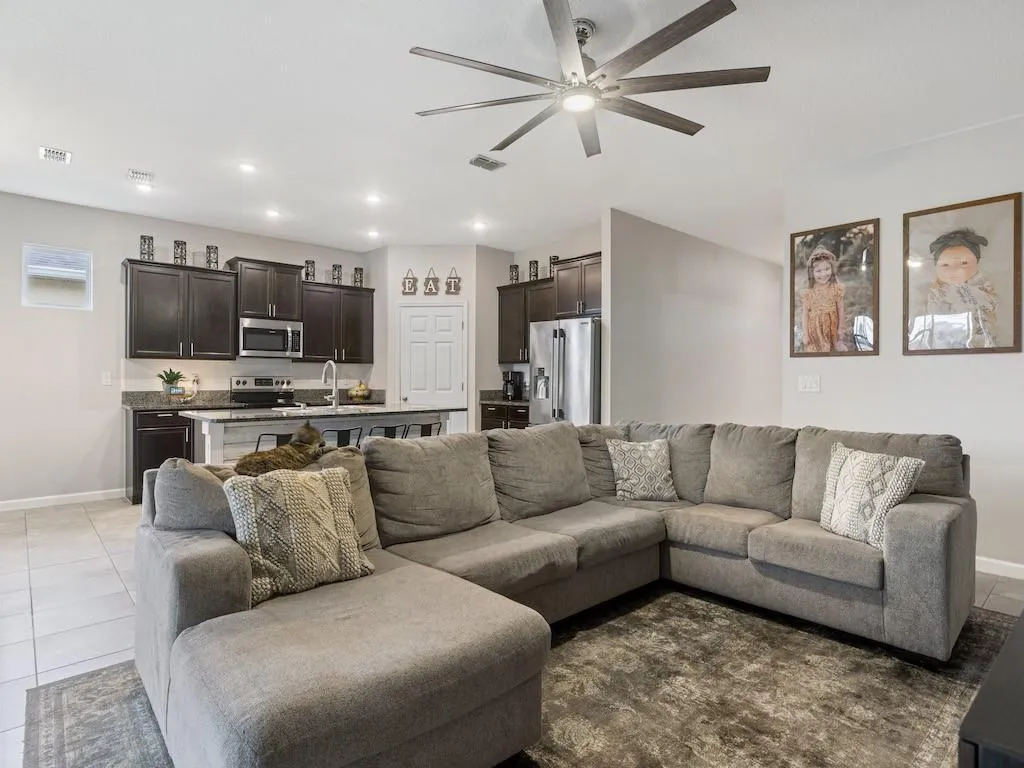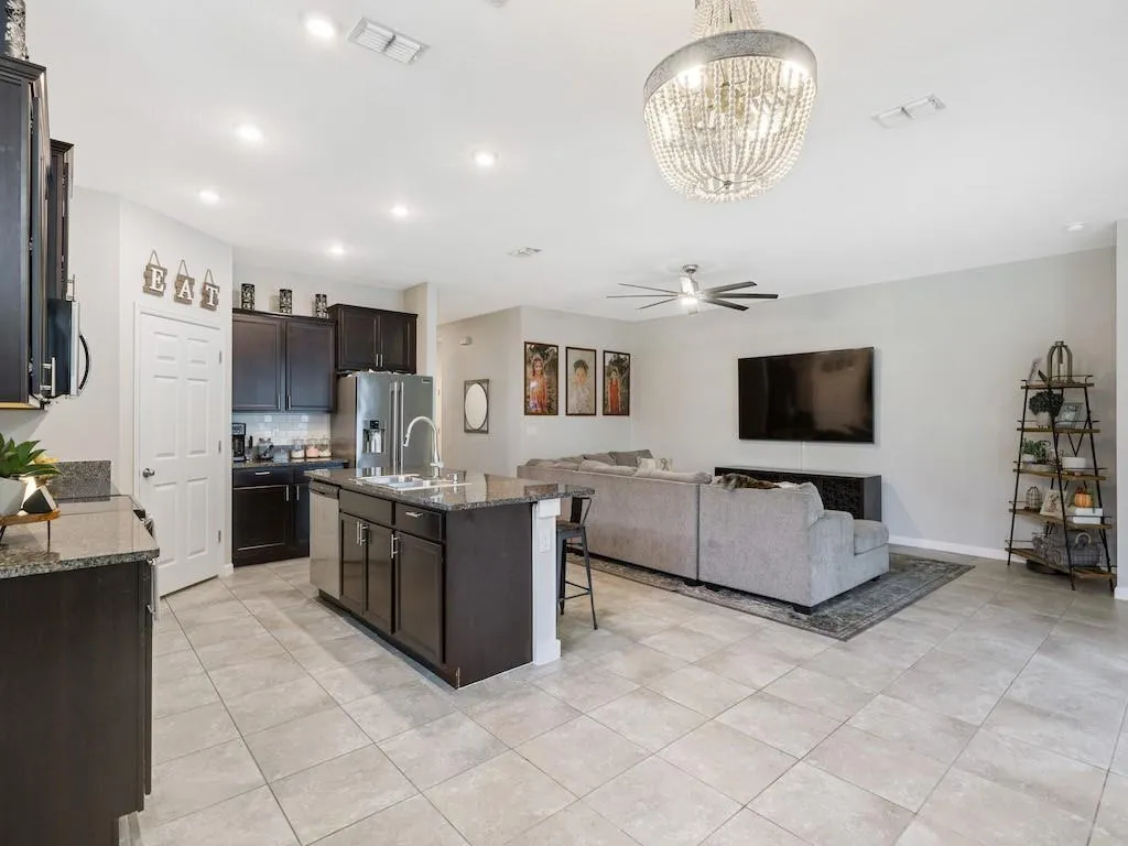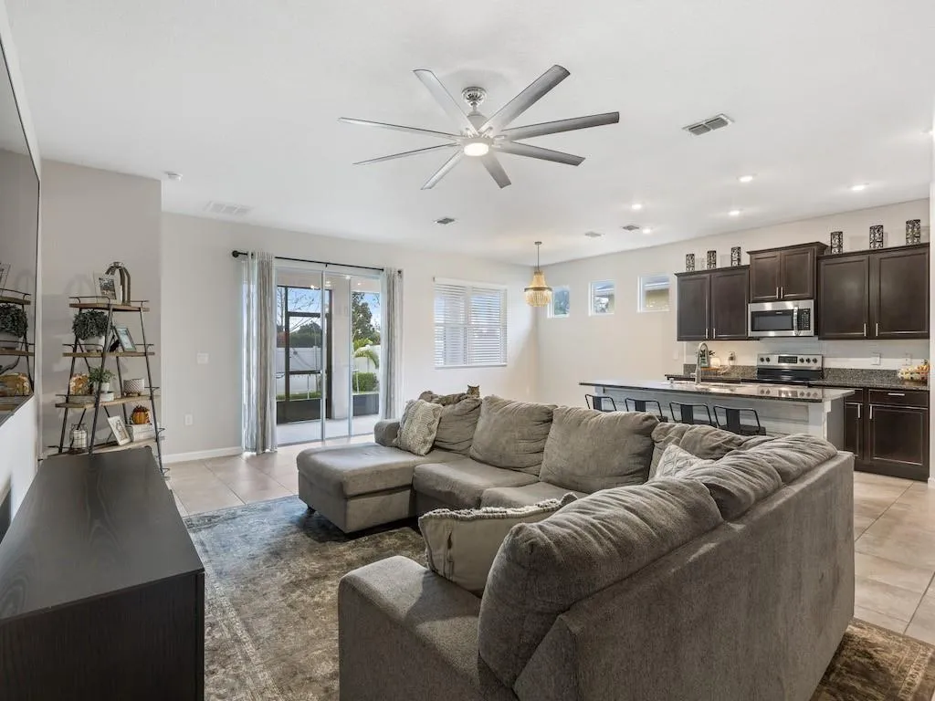 Move in Ready! Most desired Delray Model 4BR 2 BA Home in Cove at Falcon Trace! This stunning home features an open floor plan, volume ceilings, tile throughout living areas, and laminate flooring in bedrooms. The kitchen is open to the great room with a large granite island, upgraded cabinets, stainless steel appliances, and pantry. Nice owners' suite with his and her closets and dual vanities. Spacious covered and screened in porch, private fenced in back yard with plenty of room for a pool. Individual lawncare included in HOA Fees. Resort style community pool! Sizes approx. & subj to err |