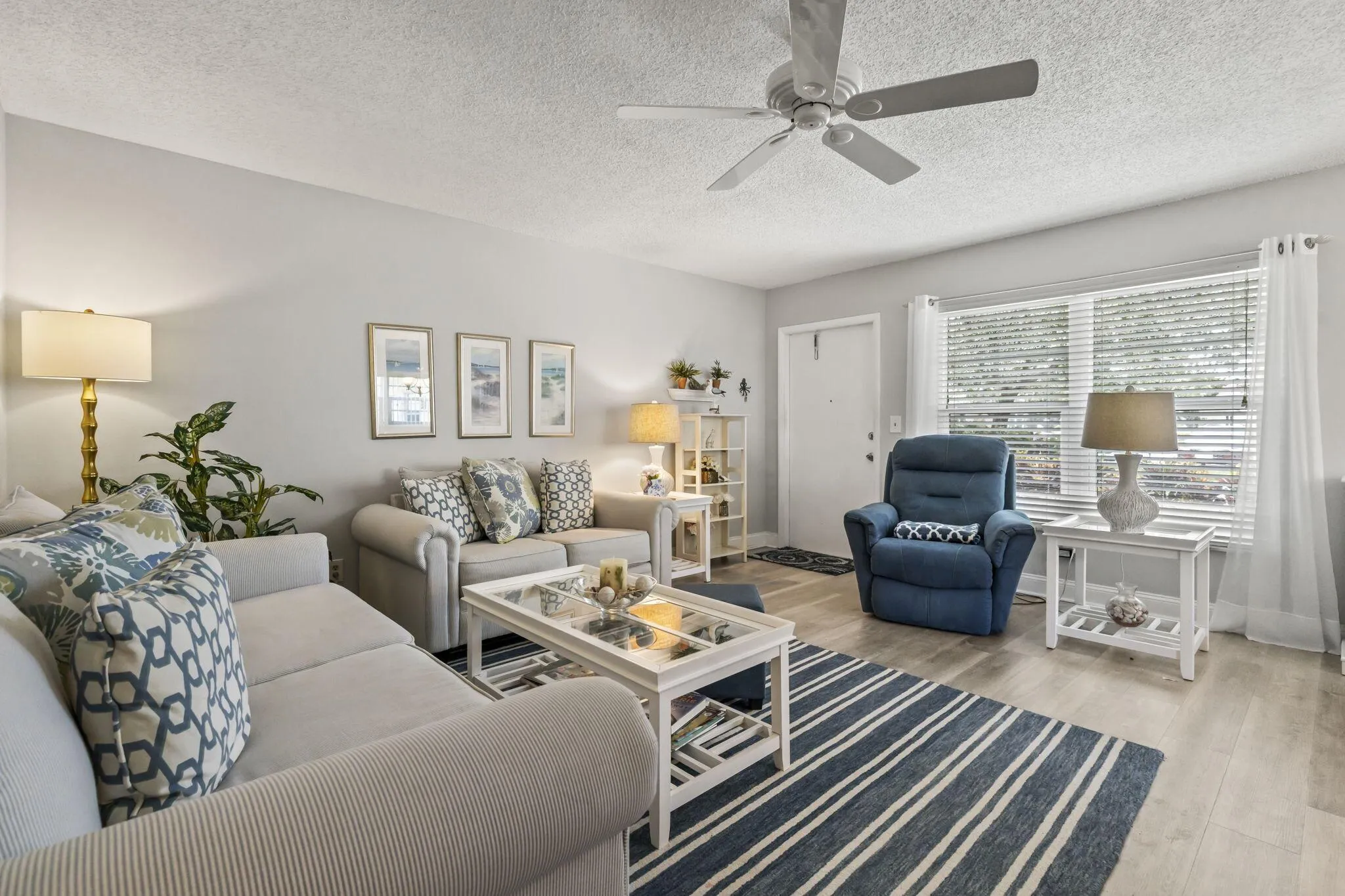 Serene golf course views combined with 1st floor garden entry. Main unit impact windows. Stylish beach decor throughout, Driftwood look vinyl floors, tile in kitchen & baths, updated vanities & ceiling fans. Active lifestyle, 4 clubhouses, 4 heated pools, 4 tennis courts & many activity rooms, Bocce, Pickleball, computer lab, picnic area, exercise room/saunas (sliding doors not impact)Close |