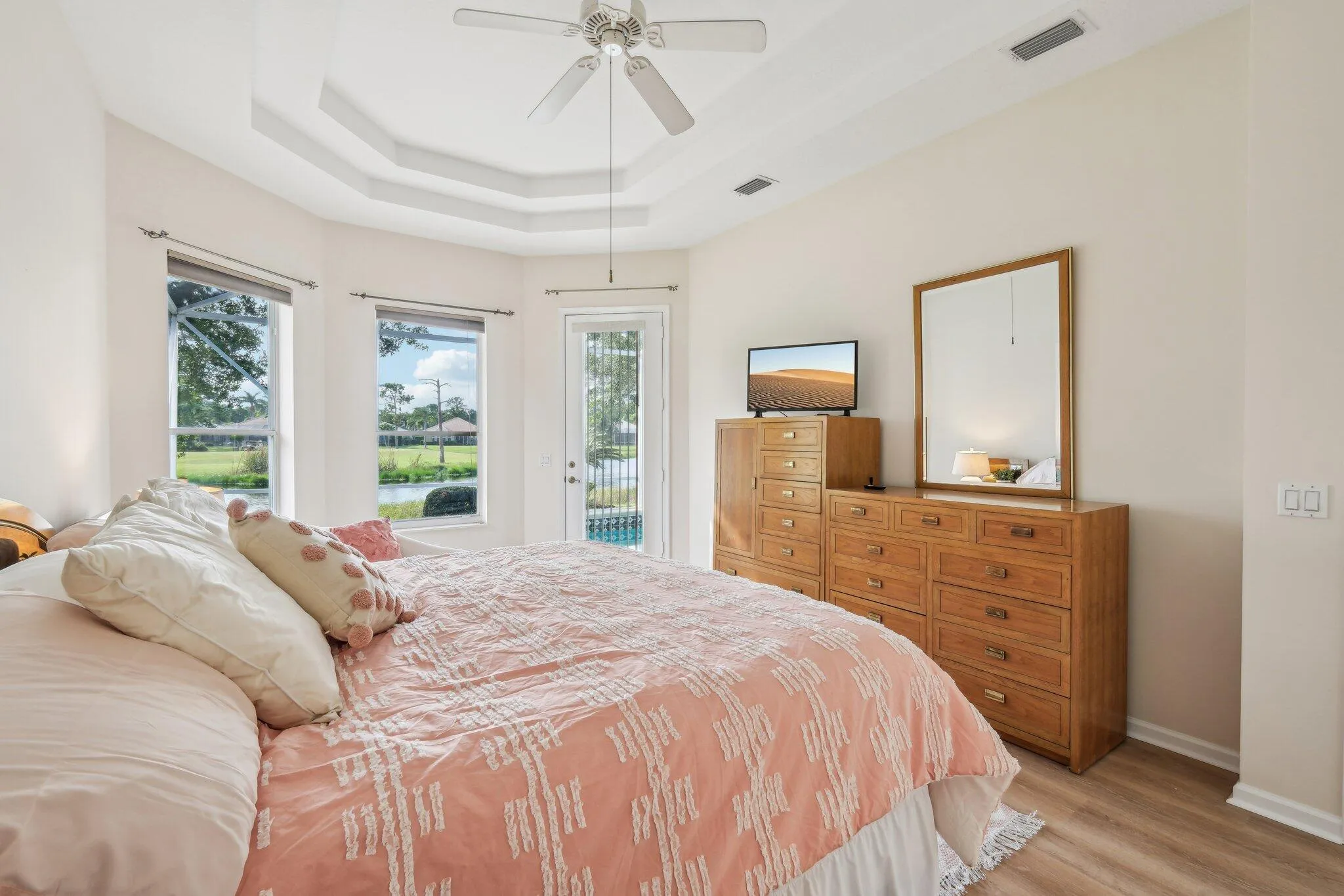 Welcome home to this beautifully updated 2-bed, 2-bath pool home with a den offering the perfect blend of luxury, comfort and privacy. Situated on a premium lot you'll enjoy panoramic views of the serene lake and golf course from your backyard while the front of the home offers rare privacy with no neighbors across the street. Step inside to find a freshly painted interior, brand new luxury vinyl plank flooring in the bedrooms and den, and ceramic tile in the main living areas. The kitchen features brand new stainless steel appliances including refrigerator, stove, microwave, and dishwasher. In your laundry room you will find a brand new washer and dryer! The 2.5-car garage provides extra space for a golf cart, bikes or storage. Located on a quiet court street this home is in one of the |