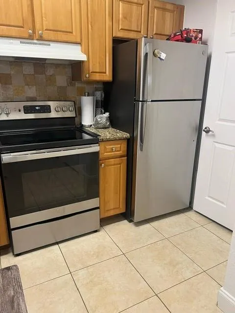 This first-floor unit shows clean with tiles floors, granite tops, newer air conditioning and looking over the garden.