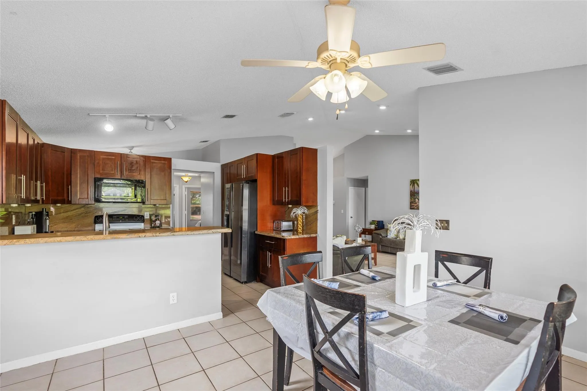Discover a rare gem in this stunning lakefront 3-BD, 2-BA home with a 2-car garage, nestled on a tranquil, tree-lined street. The heart of the home features a gorgeous kitchen with espresso shaker cabinets, granite countertops, and a Samsung stainless steel refrigerator. The primary suite offers a walk-in closet and a modern ensuite bathroom with a dual sink vanity. The open floor plan boasts volume ceilings, spacious bedrooms, and an interior laundry room. A former formal dining room has been thoughtfully converted into a 4th bedroom, with the option to easily revert. Updates include a 2016 roof, 2014 AC, and a brand-new tankless water heater in 2024. Enjoy peace of mind with accordion shutters and a low HOA fee of just $100 per quarter. The sprinkler system draws water from the lake. |