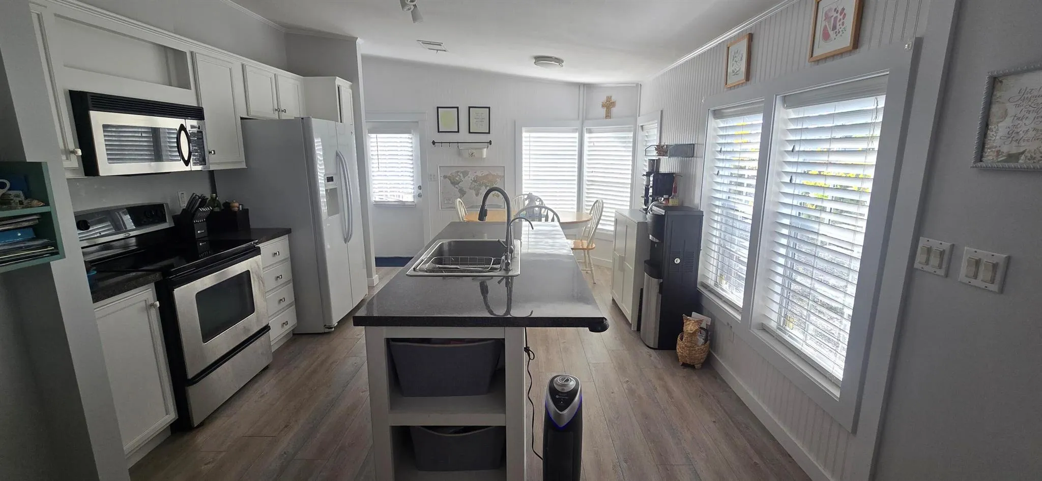 Pristine 3/2 Mobile Home on a great corner lot...you own the land! 3 car driveway with plenty of room for RV or boat. Includes a 12X24' storage building fully insulated, multi electrical outlets with heat and air, perfect for home office, currently a music room. This home is wind zone upgraded with 2x6 exterior walls and 2x4 interior walls, has a newer roof and water heater, full water softener system with a reverse osmosis water purifier. Light and bright house features vaulted ceilings with kitchen island, laundry room with washer and dryer, kitchen nook, new carpet in bedrooms and window blinds throughout. House complete with a 10x22' outdoor deck and additional 12x22' insulated storage unit with electric and lights. Well maintained property with wonderful outdoor space! |