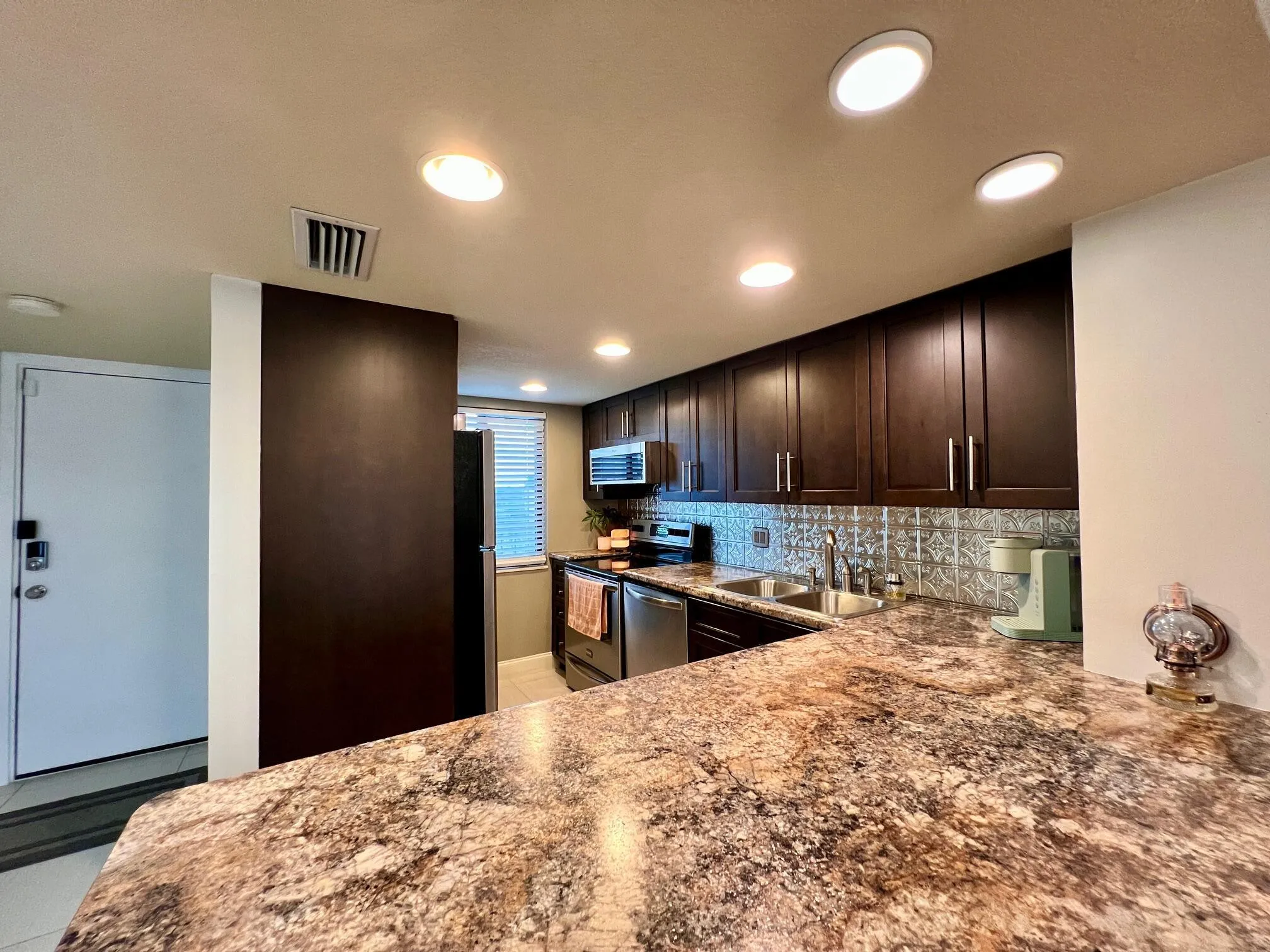 Gorgeous & Spacious Updated Penthouse Condo With Lake Views! Gracious 2/2 Floor Plan. Stylish Updated & Open Kitchen Featuring Shaker Style Cabinets, Designer Decorative Backsplash, High Hat & Pendant Lighting, Large Breakfast Bar, and Newer Stainless Appliances Including a Stacked Washer & Dryer! Two Updated Full Baths. Large Bedroom Suite W/Updated Full Ensuite Bath. Balcony Offers Outdoor Space Lake & Tennis Court Views. Large Format Neutral Tile Flooring Throughout. Knock Down Ceilings (no popcorn!). Impact Windows, Including the Slider W/ Privacy Frost, Completed in 2022. Nicely Maintained W/ New Water Heater (2022) & Electrical Panel (2023). Dining Table & Chairs, Two Bar Stools, Couch, Patio Table, Chairs, Herb Garden Included. A Well-Priced Gorgeous Place to Call Home |