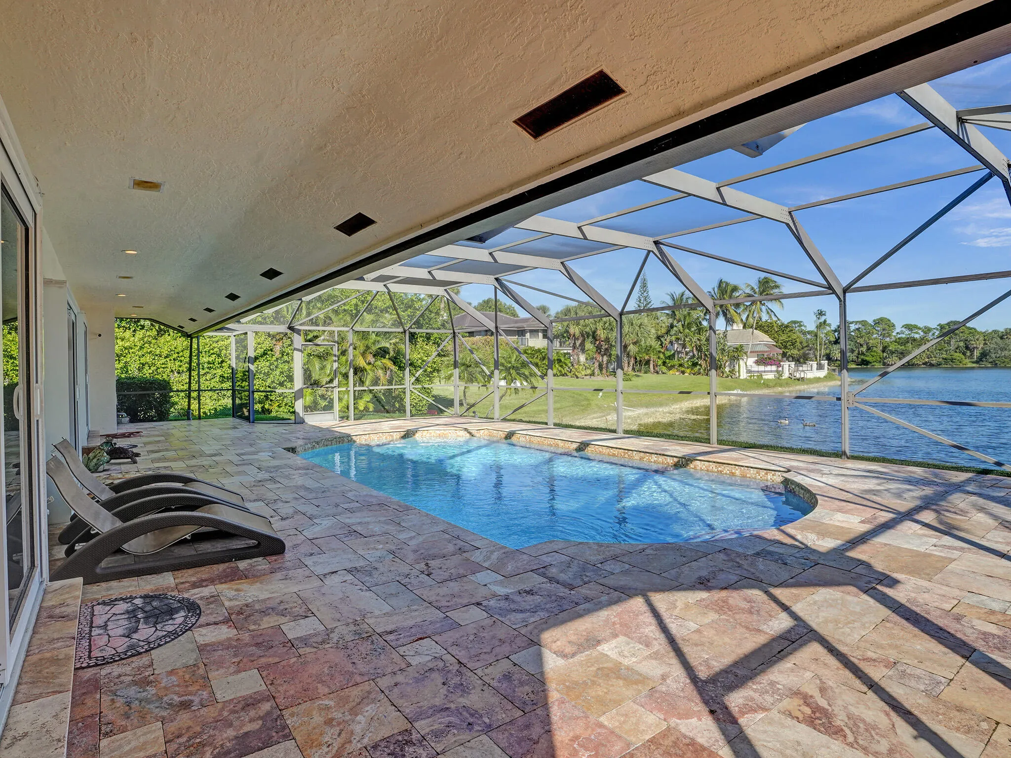 A unique opportunity to own this gorgeous private estate located on a waterfront lot in the charming gated community of Boca Raton Sailing & Racquet Club. This 4 bedroom home with a huge upstairs 5th bedroom/bonus room, plus 3 full baths features open living areas, updated bathrooms, screened pool overlooking the lake, vaulted ceilings, marble and hardwood floors throughout the entire home, full hurricane protection with a whole house generator, 800 gallon propane tank, 6 skylights, tankless water heater, updated kitchen with stainless steel appliances and granite countertops, large laundry room, long private travertine driveway and all located on a long lake view cul-de-sac lot. The community offers Tennis/Pickle-ball Courts, Clubhouse, Boat Ramp (no gas motors) and walking trails. |