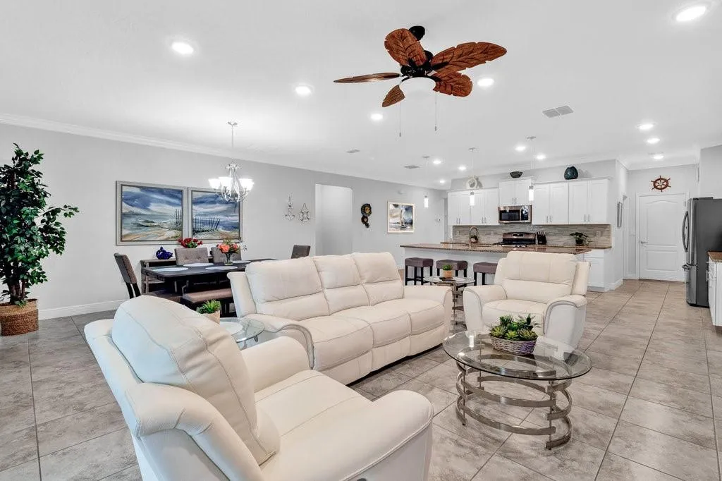 Enjoy upscale 55+ living in Harmony Reserve designed for an active adult lifestyle with comfort & elegance in mind. Step outside onto an extended screened lanai with a 22x11 SALTWATER pool perfect for relaxing, entertainment & family. This beautifully maintained residence showcases the 2,070 sq ft Jensen model by Maronda Homes offering stylish tile flooring throughout, crown molding, recessed lighting, walk-in closets & impact windows. The oversized island kitchen features granite countertops, white cabinetry, stainless steel appliances & gas cooking. BONUS; check out the 4-foot extended garage too. |