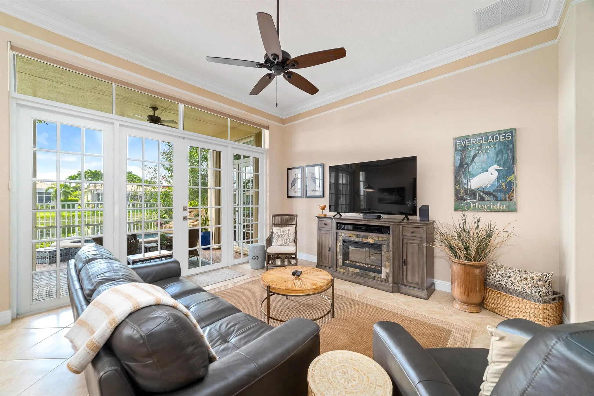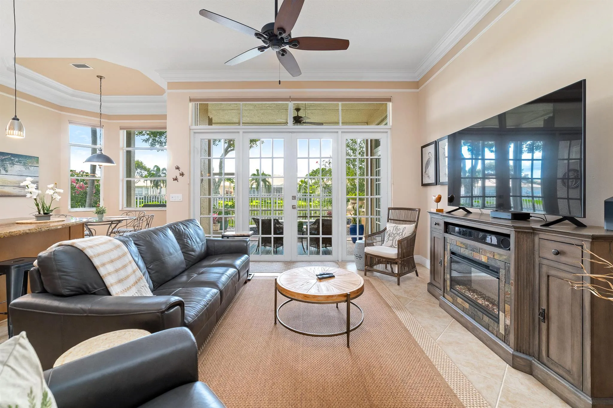 Absolutely stunning, model-perfect, 2 bedroom plus a SEPARATE DEN, 2.5 bathroom, 2-car garage home with breathtaking LAKE views and oversized in-ground hot tub, in the active, exclusive 55+ Buena Vida development! Over $100,000 in unique upgrades (see the list). The home is completed with unique upgrades including impressive 12' ceilings, impact French double doors at the entrance (2020), French double doors to the patio, primary bedroom and den, crown moldings and recessed LED lights throughout, tinted windows, plus tray ceilings topped with moldings. There is beautiful, freshly re-grouted tile diagonally in the living areas and den, and gorgeous Italian wood-like tile in all bedrooms (2020). The eat-in kitchen is equipped with newer, high-end stainless steel appliances (2021-2023), |