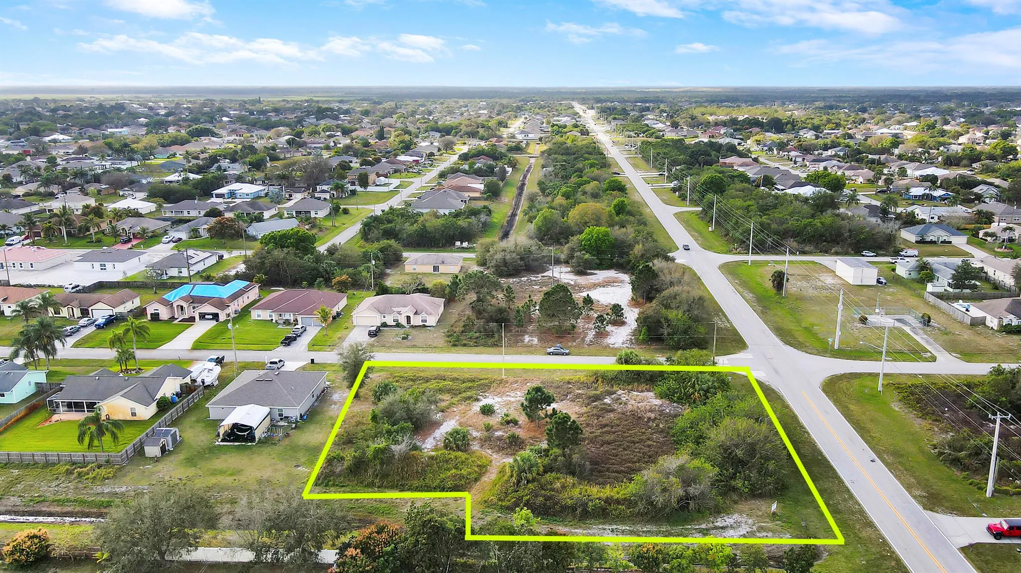 3 Commercial Lots wrapping around the corner of Port St. Lucie Blvd & Hamberland Ave. 207 feet on Hamberland & 154 feet on Port St. Lucie Blvd. A significant drainage canal in the rear of the property provides additional privacy in the back of the property plus positive outfall for development, which might help with set backs onsite water retention, etc. The existing commercial zoning allows many uses, including, but not limited to, mixed use, neighborhood commercial uses, offices, etc. Cleared and ready for your new project. It also may be possible to build 3 separate homes. Property is zoned Professional. Single Family homes are not permitted. Rezoning would be required. Regarding multifamily, max residential density is 8 units subject to parking. Owner will consider own |